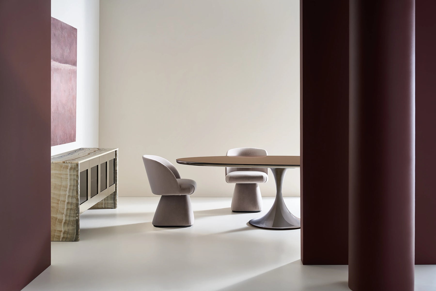 Our reinterpretation of the mid-century modern tulip table makes an eye-catching statement in a dining room or professional office.