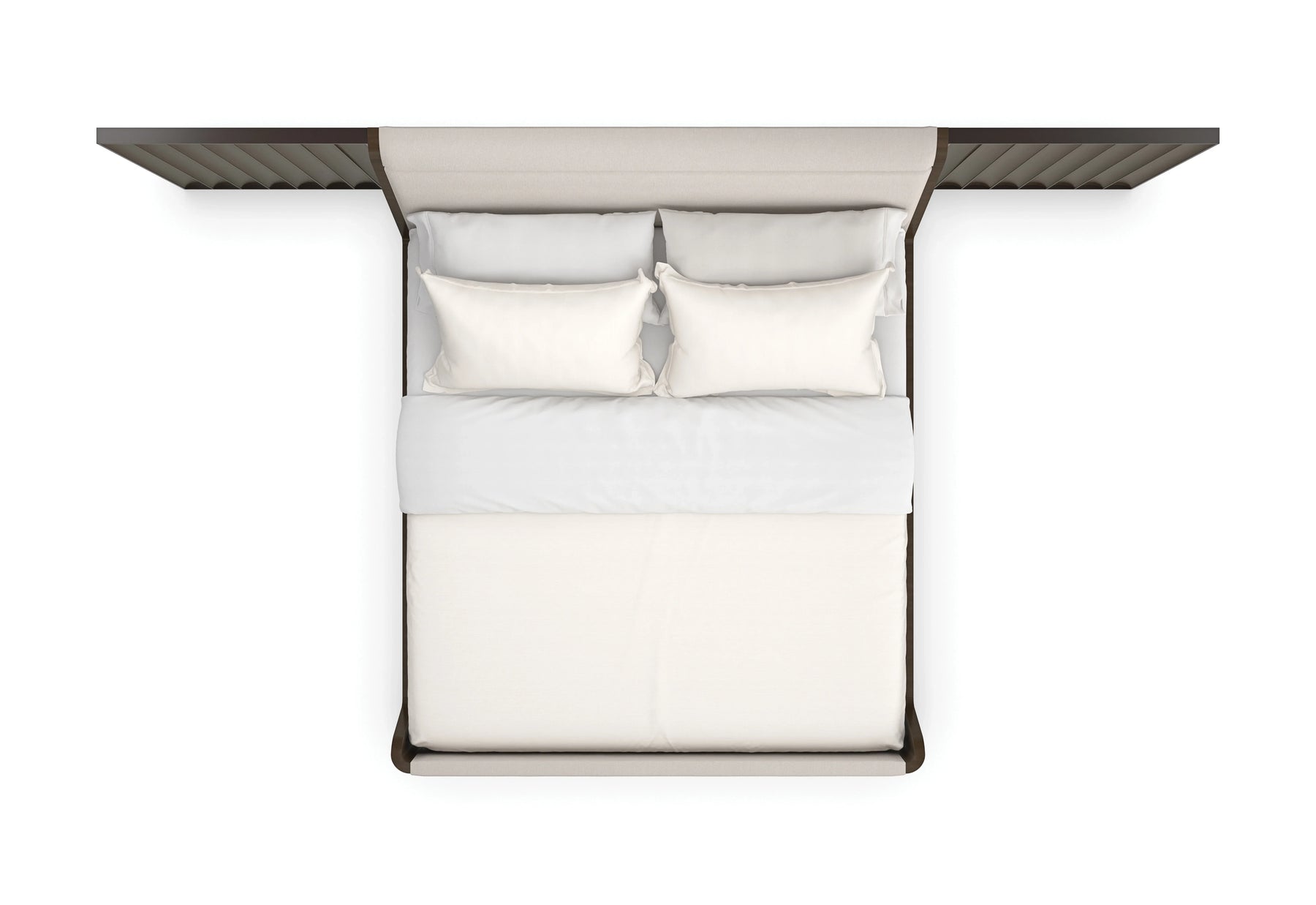 Inspired by neoclassical architecture, this contemporized sleigh bed makes a prominent statement with overscaled fluted wing panels, finished in a mix of Otter and Dark Chocolate. Features a comfortably canted headboard and clean-lined footboard, dressed in a faux slub silk that mimics microfluting found on other pieces in our collection. Sold as a set of two, wing panels are designed with cord access along the bottom corners for added function.