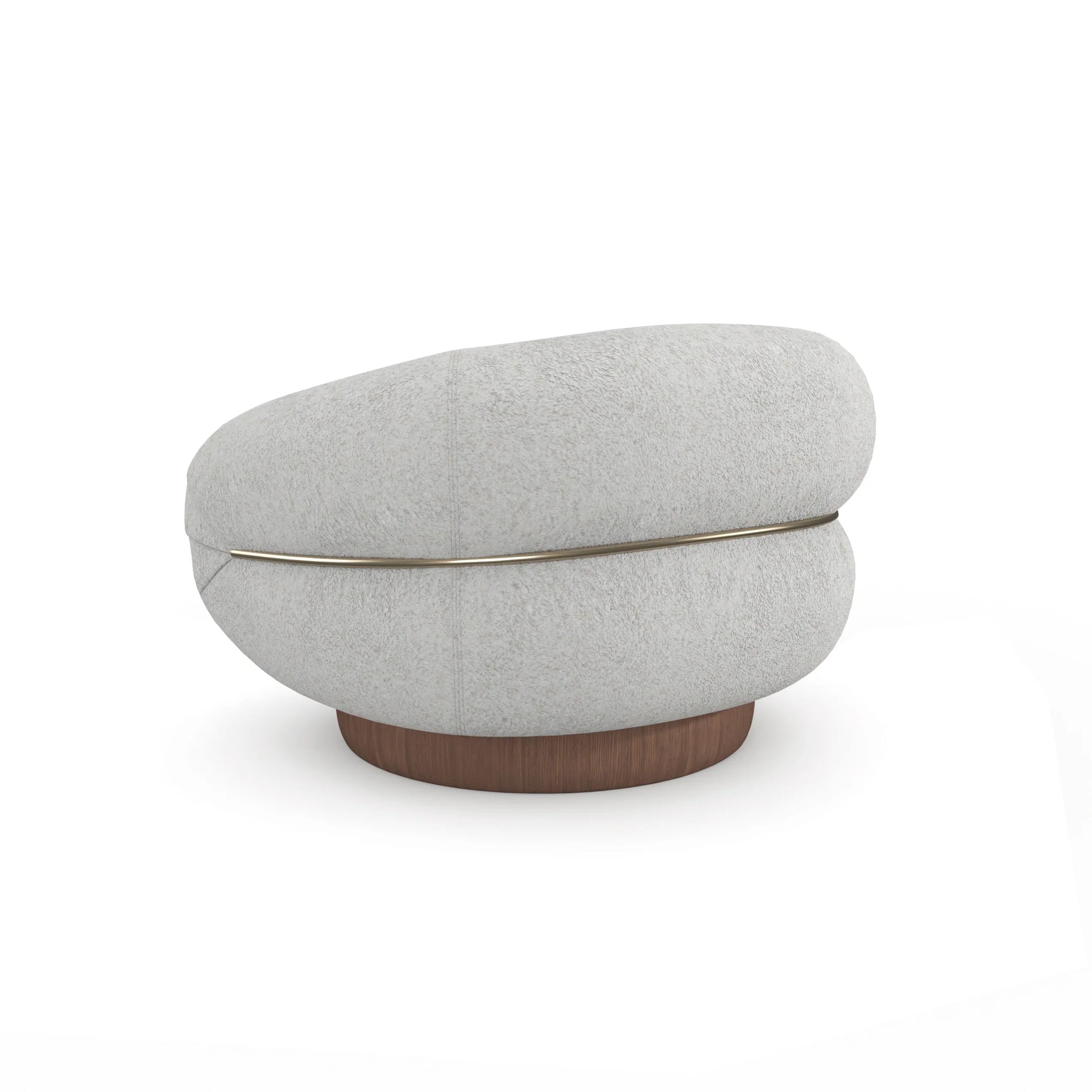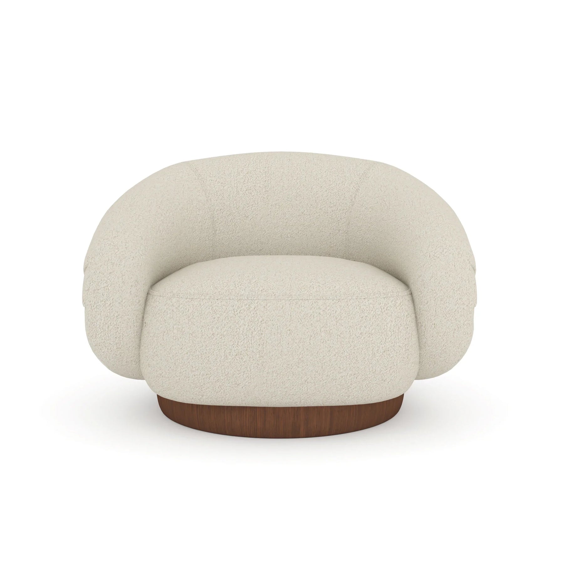 They say what goes around comes around; and it is no different with soft, amorphous chair. Retro in feel, but updated in style, this contemporary chair offers the ultimate in comfort with its deep seat and plush bolster surround. Fully-upholstered in Ivory Mélange Performance Bouclé, a thin Champagne Gold metal bar cinches the back to give it shape. The swivel base in Retro Walnut displays a soft ogee curve.