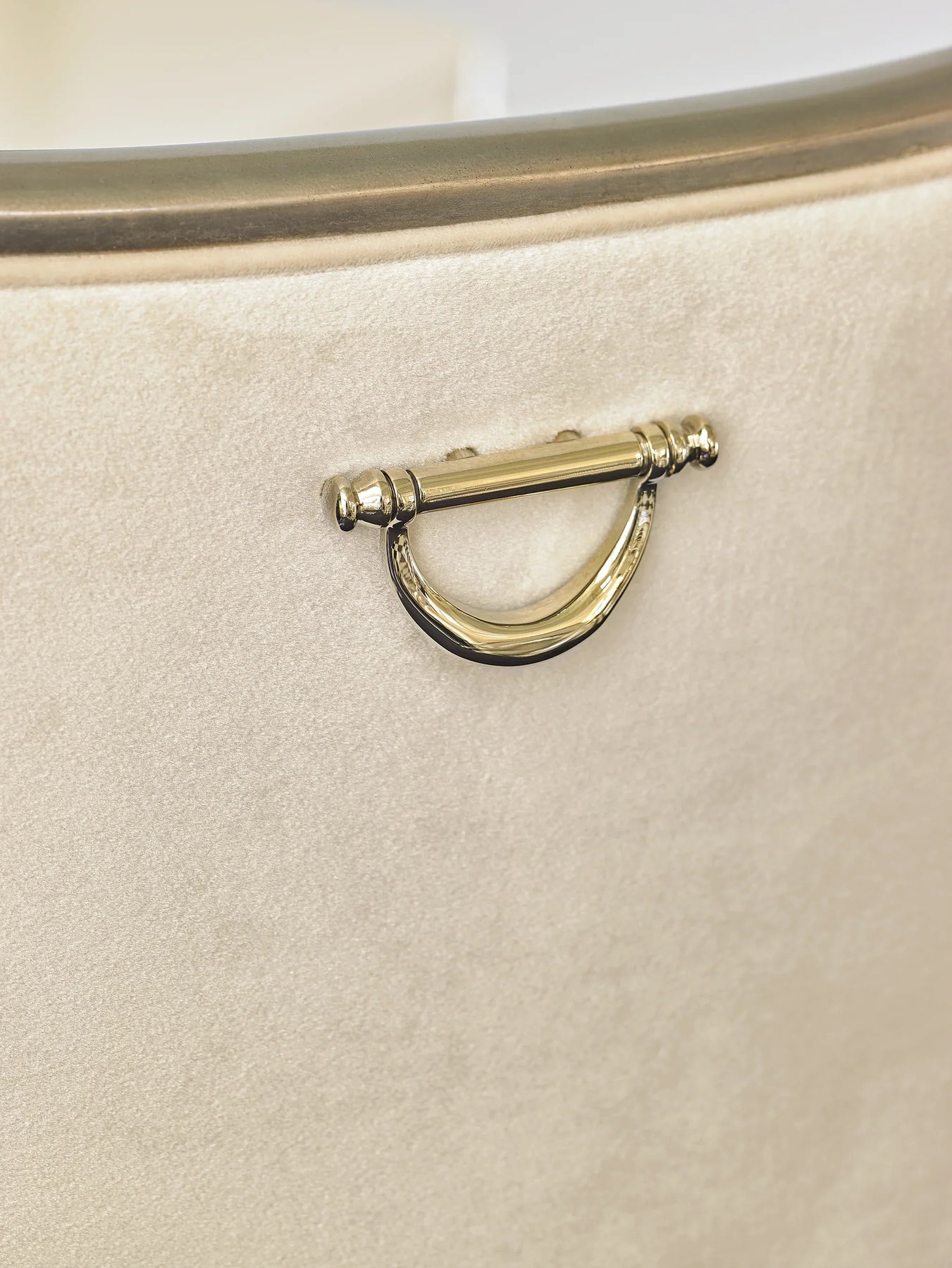Haute couture finds its way into the equestrian elegance of this beautiful dining side chair. The high back of this softly winged chair is artfully tailored in crème velvet and beautifully appointed with a contemporary gold horseshoe handle at its top back. The gently curved wood legs are tipped with gold metal ferrules in the front. This is a sumptuous chair that pairs beautifully with traditional as well as contemporary dining settings.