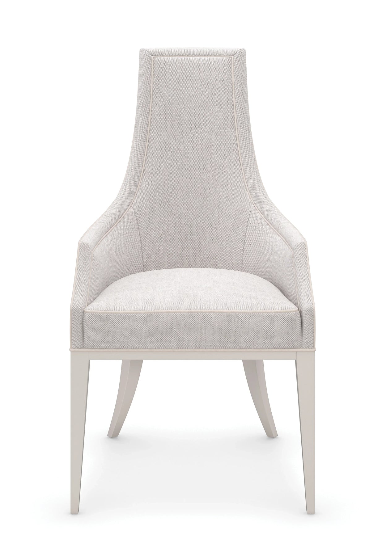 With gently sloping arms and a tall tapering back, this arm chair invites gazing and gathering with guests. Dressed in a lustrous basketweave fabric with a complementing beige welt that subtly frames its elegant silhouette. An exposed wood frame and legs finished in Stardust add a classic detail with a touch of luxe.