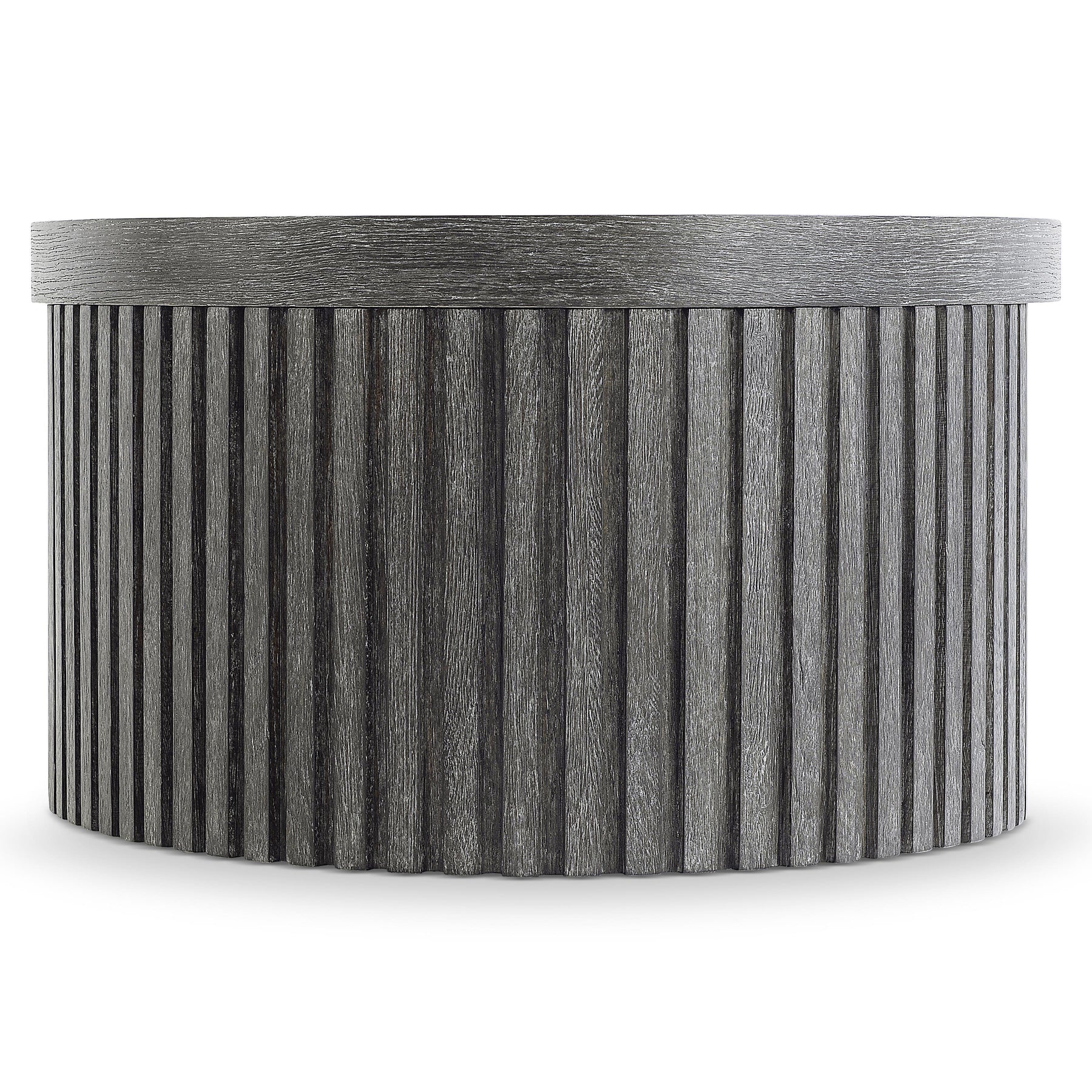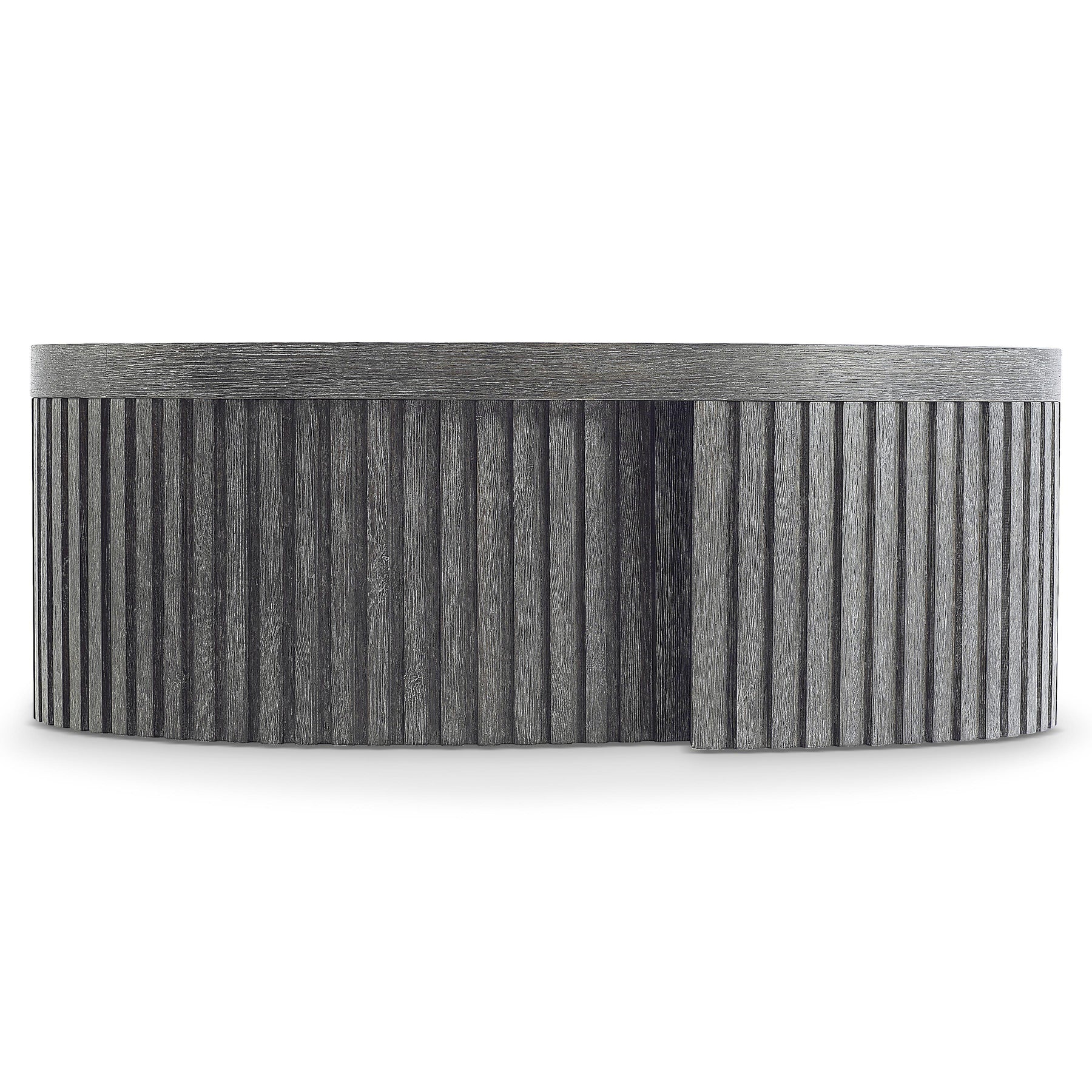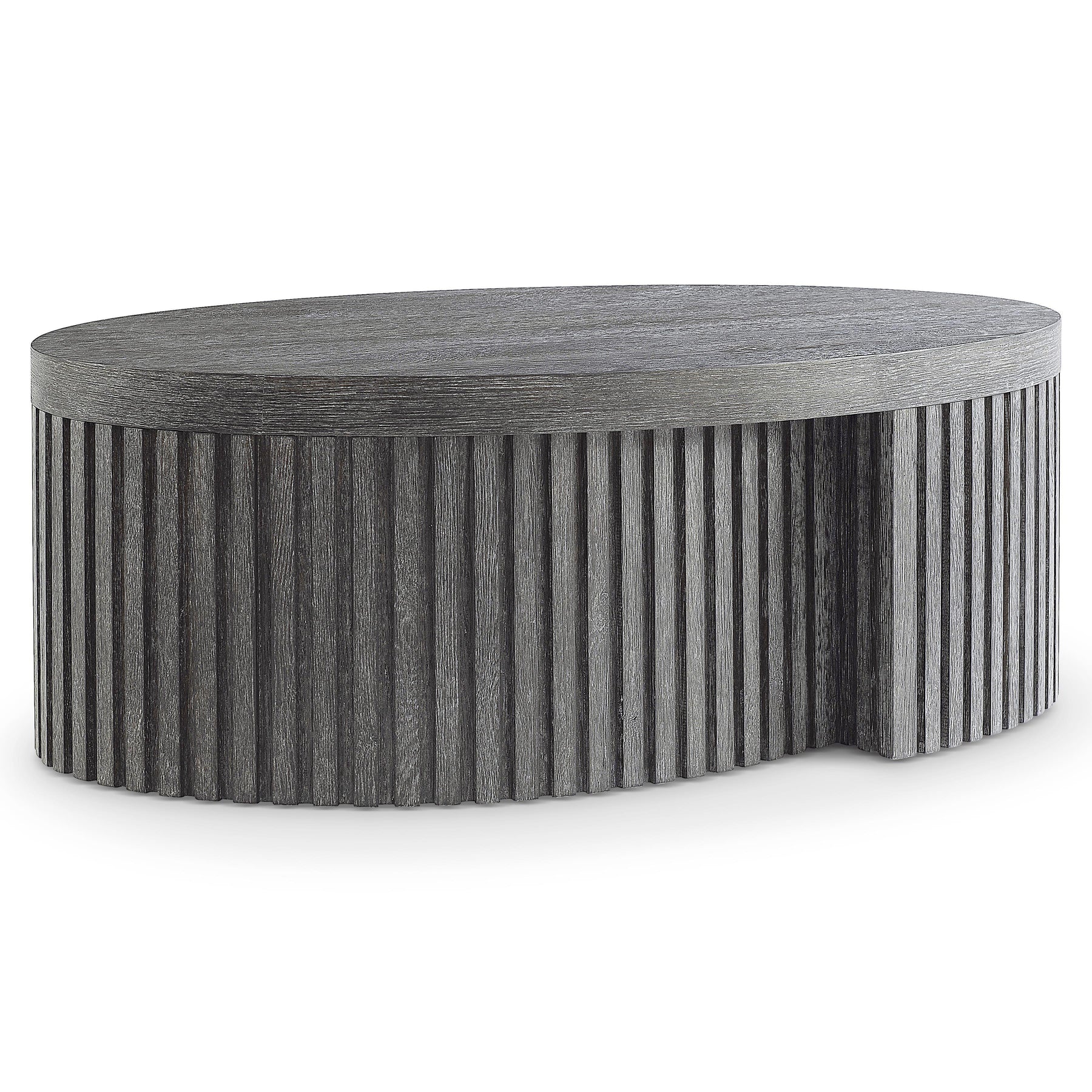 A Moody, Dark Finish And Architectural Inspiration Give The Menton Cocktail Table Its Distinct Design. The Base Wraps Around Like A Ribbon Crafted Of Linear Reeding. It Supports An Oval Top That Showcases The Woods Natural Grain Through The Deep Sutton Finish.