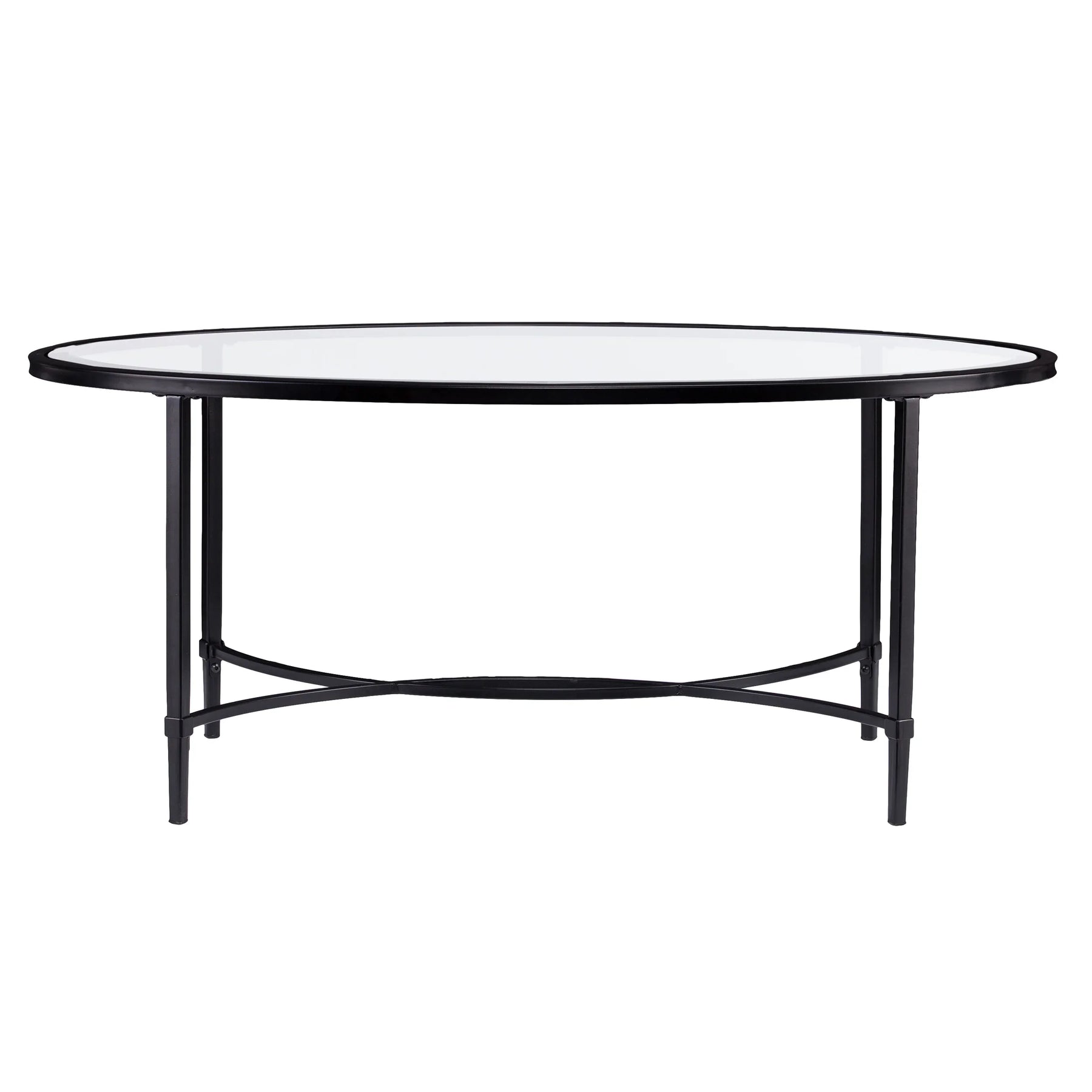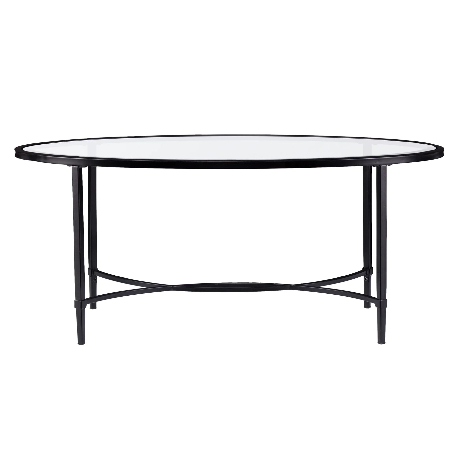 Bring simple luxury to your home with this metal and glass coffee table. A black iron frame creates sleek sophistication, while the wide-beveled glass tabletop offers plenty of room to display decor or hold your drink. Add this streamlined design to your small space floorplan, or place in your living area to upgrade your modern aesthetic. Come home to classic elegance with this oval coffee table.