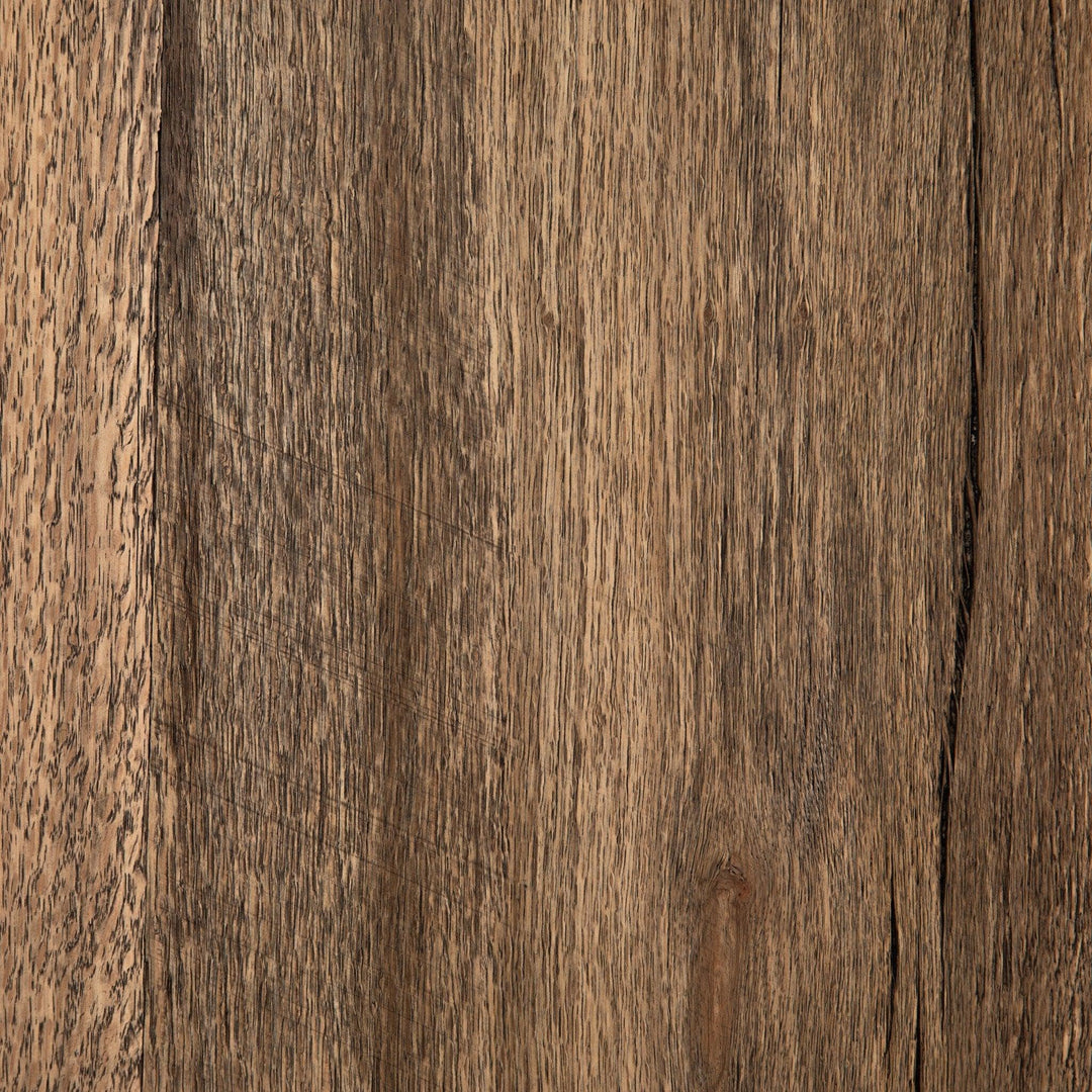 An organic-spirited statement piece. With thick wide proportions a rectangular console table of distressed iron tops an intersecting base of rustic character-rich oak with beautiful highs and lows.