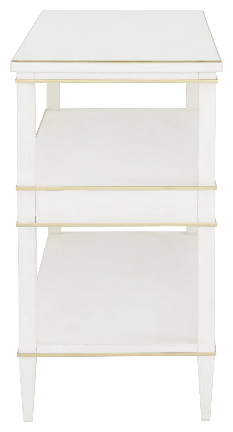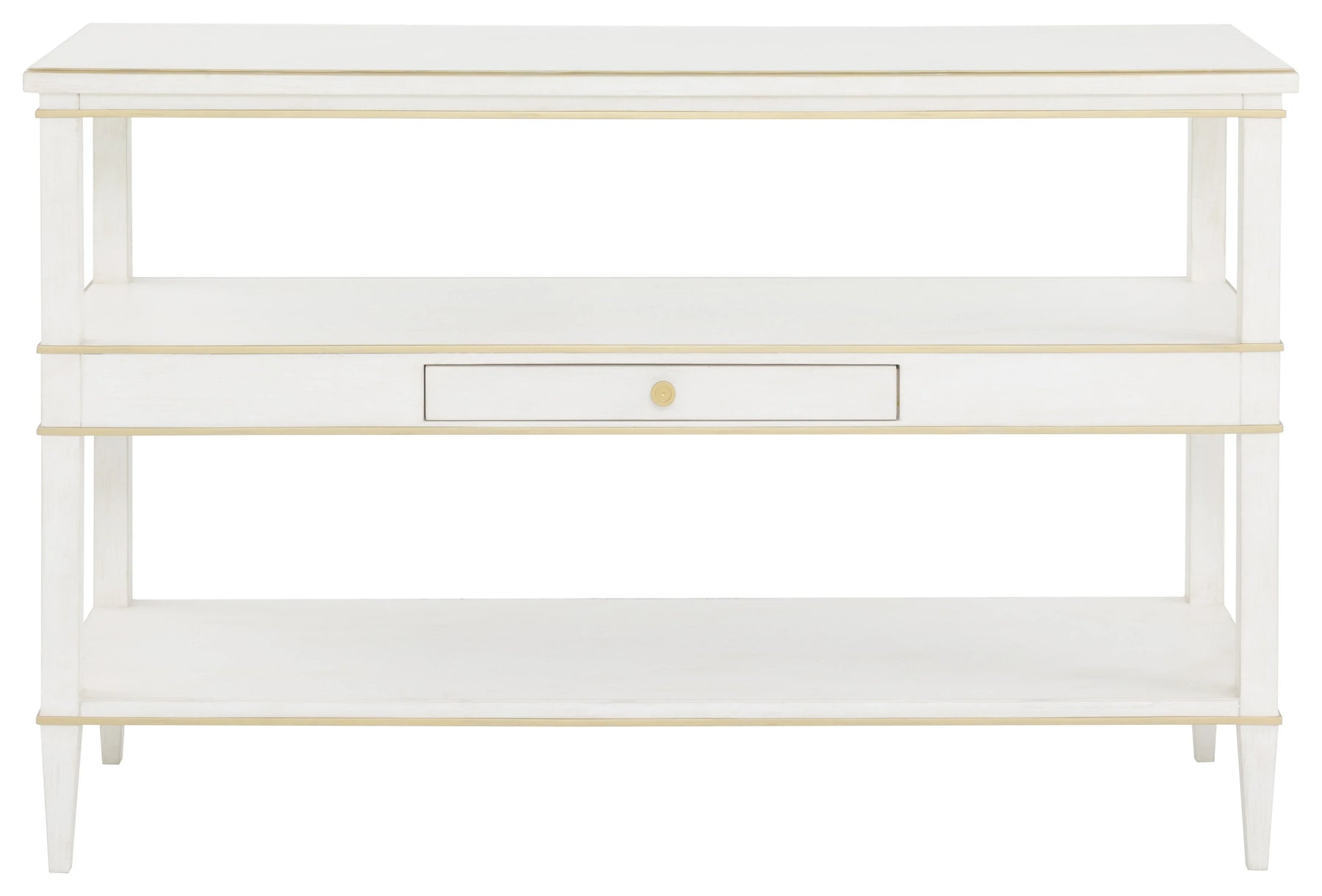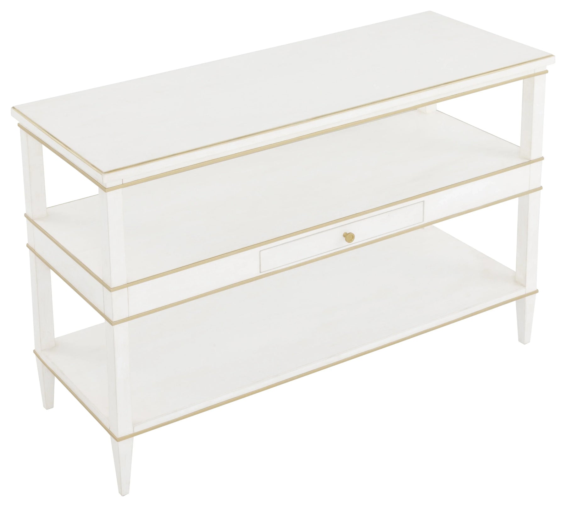 Our Camille Collection merges traditional design elements with a fresh perspective to create a classic and timeless look for today?s modern living. Crafted from rubberwood solids, Camille's classic silhouette is draped in a Linen finish and trimmed in Antique Gold metallic striping. This versatile and storage-friendly collection includes a 24" square and 24" round end tables with pull out shelves and drawer, cocktail table with one drawer, and a console table with one drawer. Camille is stocked Linen or available in 40+ additional custom finishes via our Monogram Program.