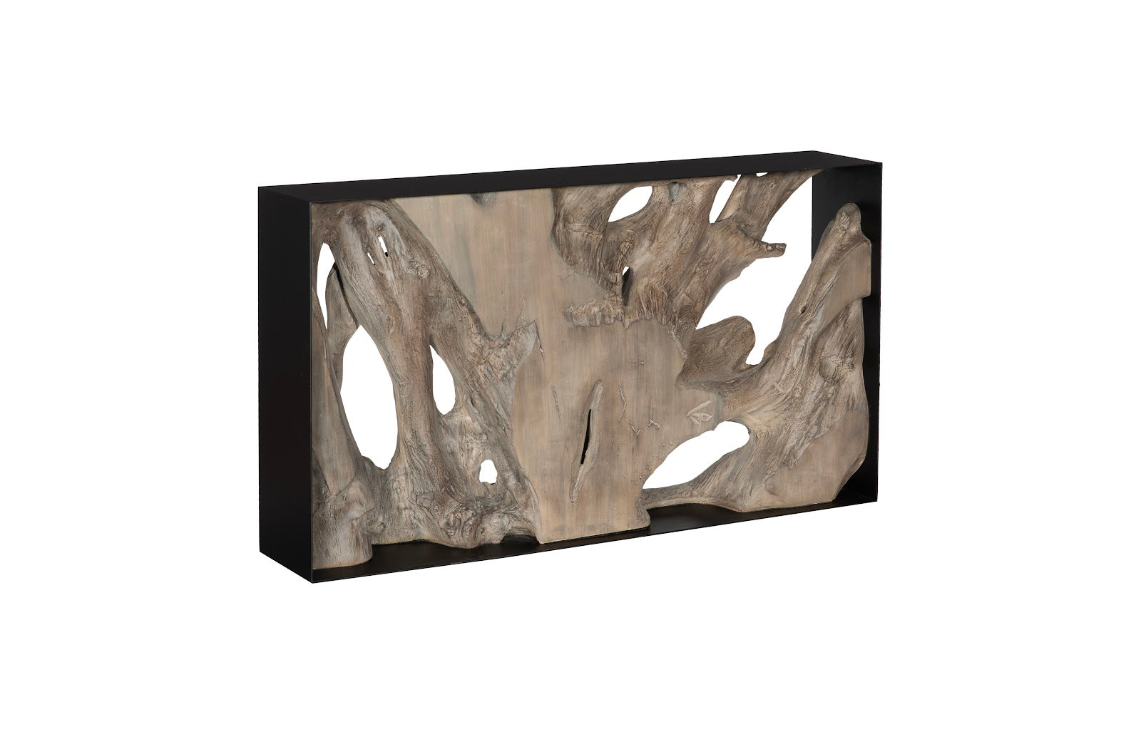 When we saw how dynamic our framed natural wood consoles looked, we knew it was time to cast a beautiful piece of teak root from composite and encase it in iron. Both sides of the Cast Root Framed Console Table are finished and unique so you can place it so it's seen from both sides. This version of the root console table is in a faux bleached finish that will offer a subtle yet stylish touch to any space.