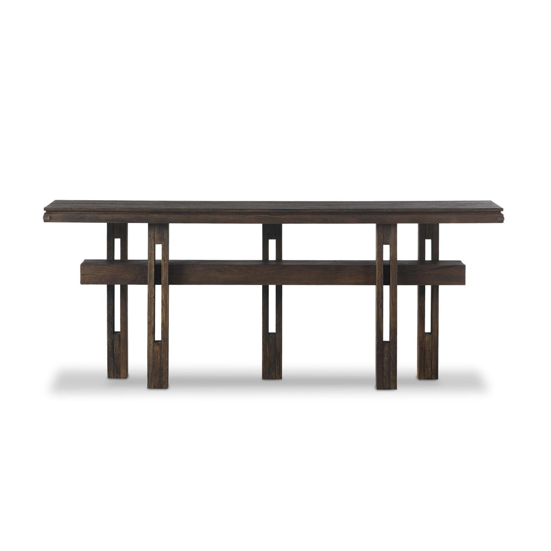Crafted from smoked alder this Wabi Sabi-inspired console brings an organic look to your space. With staggered legs chamfered edges and a central stretcher this piece is perfect for media display or styled in the living room or entryway.