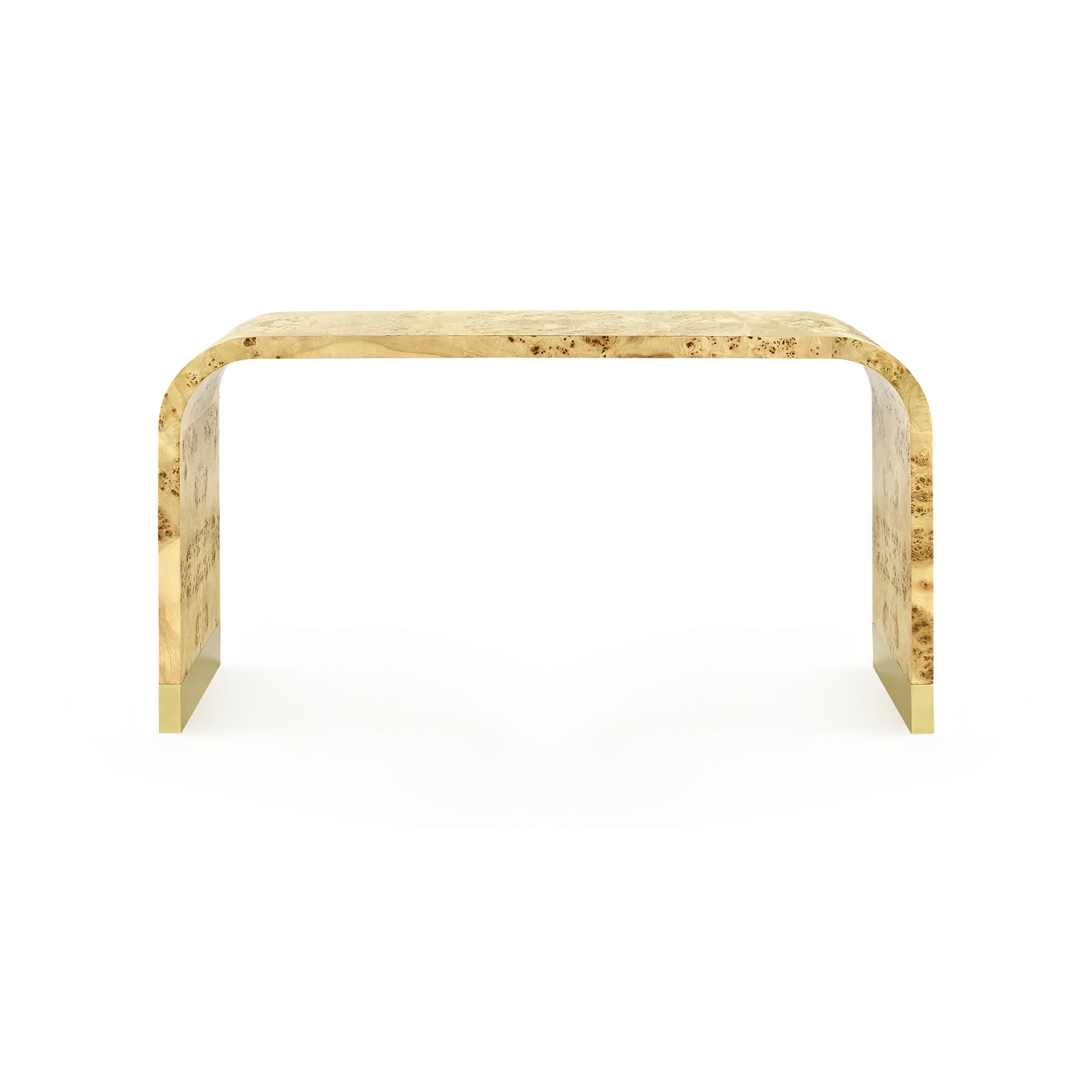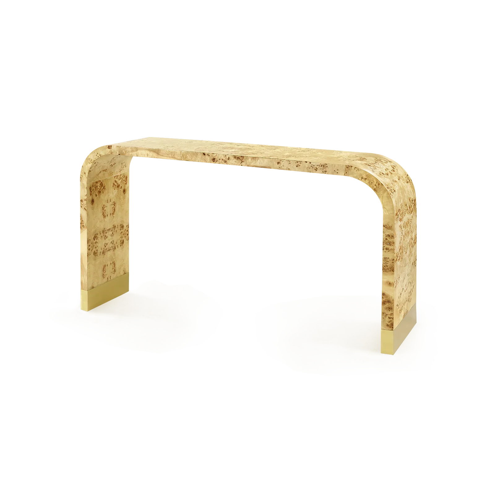 We love our Emil Collection for its embrace of retro silhouettes and cosmopolitan style. The naturally vibrant patterns found in burl wood have a distinctively 1970s feel—all kaleidoscopic swirls with a bold sense of cool. Our Emil Console is the classic embodiment of the beloved vintage waterfall table, with an inherent softness stemming from its seamless, curved design. The sheen of its lacquered finish is matched by the brushed brass accents of its elongated sabots. The Emil Console can be paired with a plush bench or chair to create a sitting area in a foyer or living room, or simply used a showcase for decorative art, vases, candles, and more. The Emil Collection exudes elevated richness.