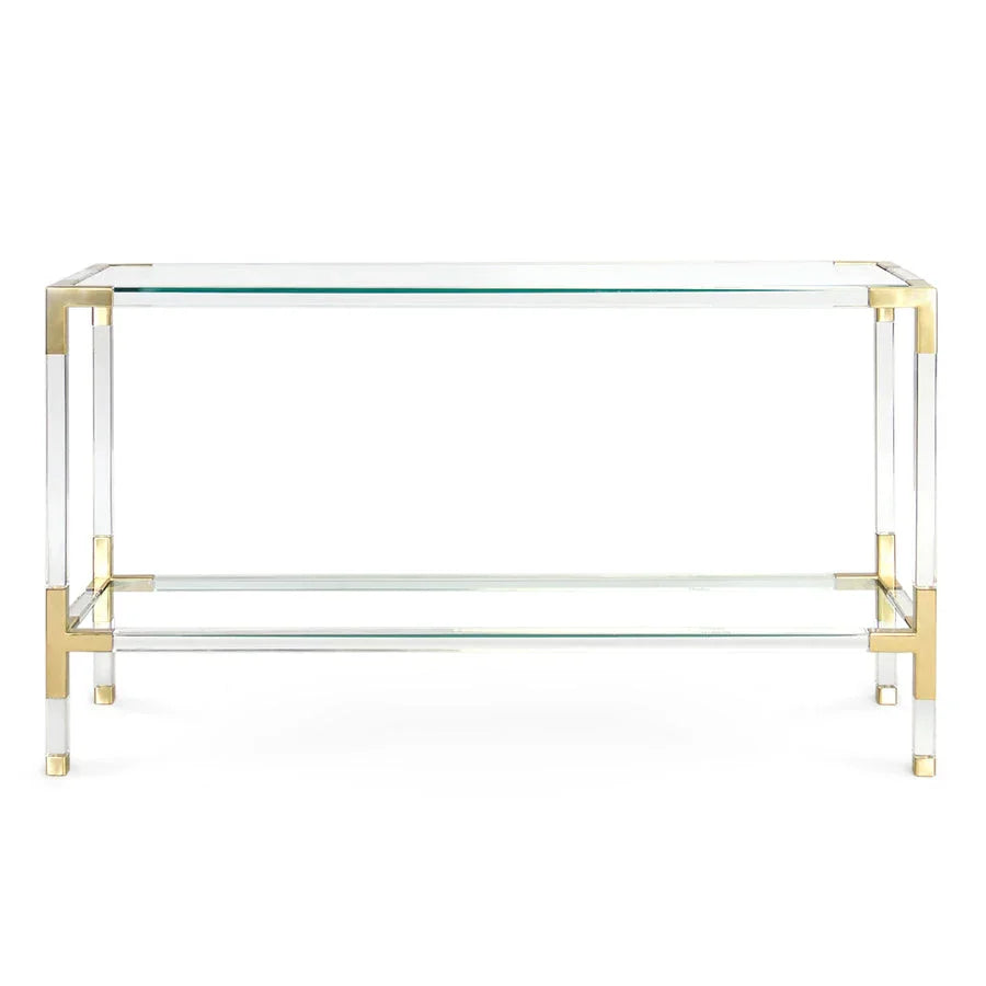Luxe clear acrylic with brushed brass accents and fitted with a low glass shelf for baubles or books. Our Jacques Console works perfectly behind a sofa or looks fab in a foyer.