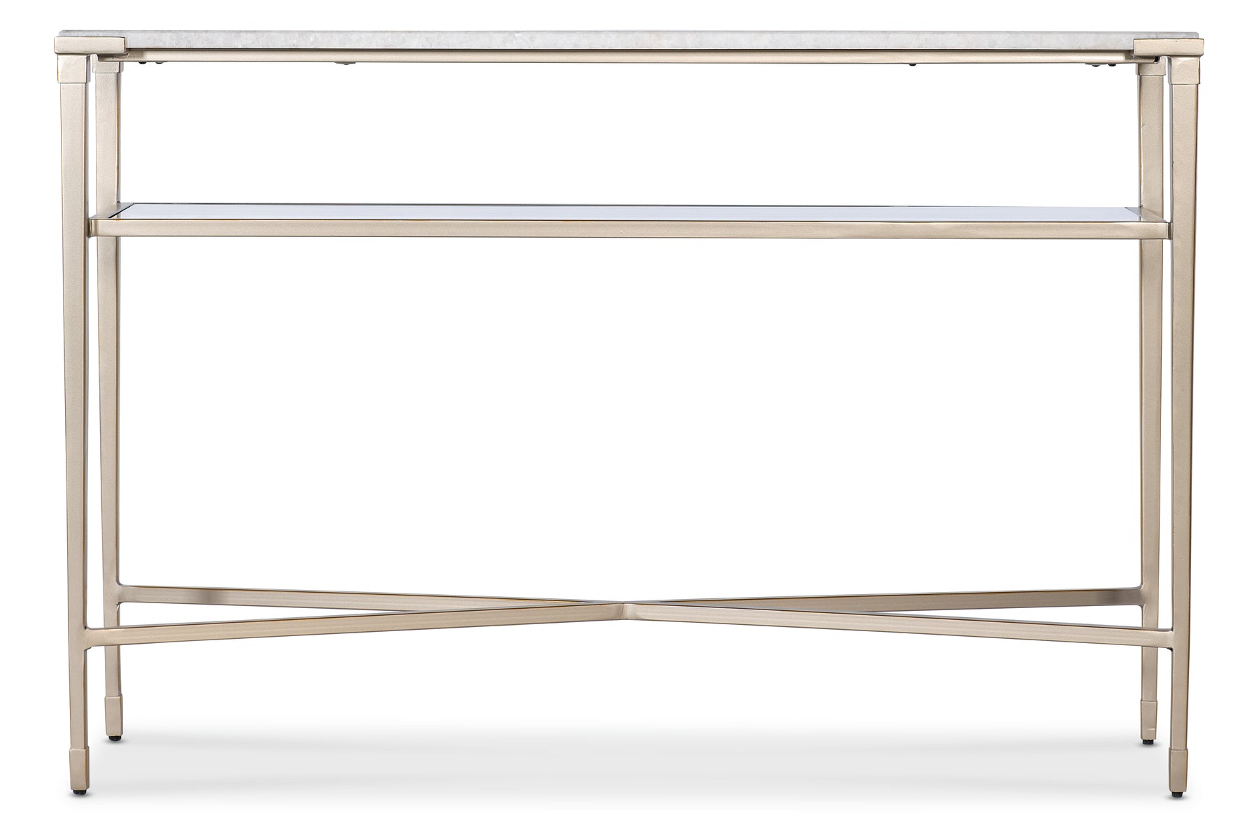 Redefine your entryway or living room with the sleek Jen Console Table from the Melange collection. Boasting a natural white stone top, slim champagne metal legs, and a clear glass shelf, this rectangular console table exudes modern elegance. Its airy design makes it a versatile piece, ideal for showcasing art, decor, or everyday essentials.
