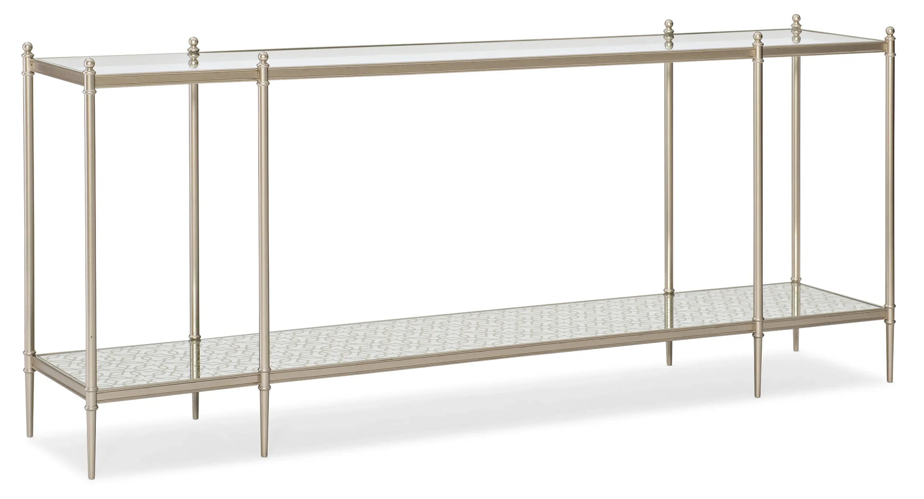 Express your personal style with the addition of this head-turning table and you’ll elevate the design value of the entire room. Crafted of glass, mirror, and metal, it wears a Neutral Metallic finish that complements both gold and silver tones. This perfectly proportioned table has a classic silhouette and crisp angles that glint in the light and look stunning both day and night. A clear glass top lets you look through and see the lower shelf where a Silver Leaf pattern adds artistry to its back-painted mirrored surface.