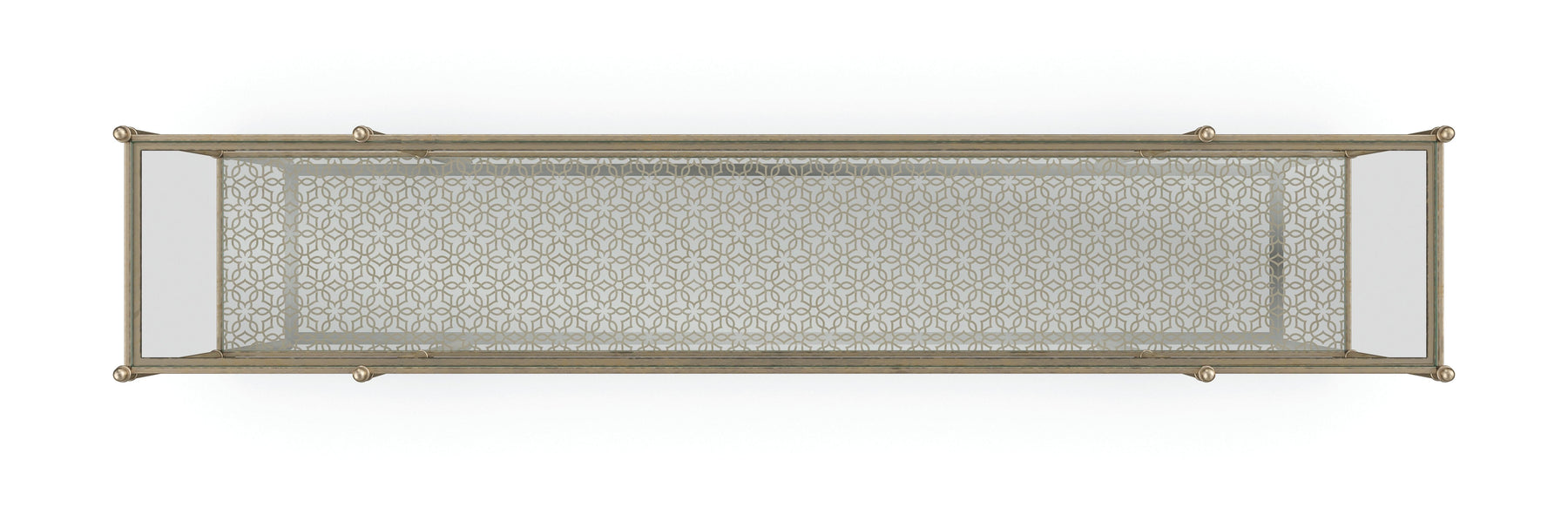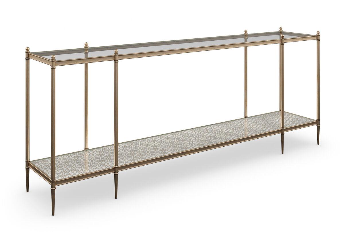 Metal frame finished in New Gold. Clear glass top. Silver Leaf pattern on back of bottom mirrored shelf.