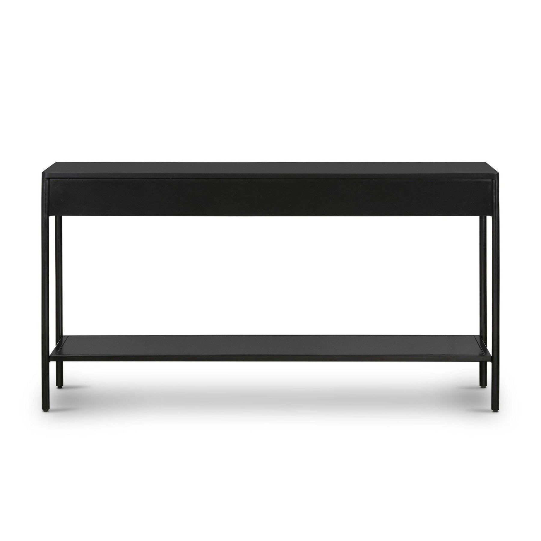 Bring a softened industrial look to the media room dining space or entryway with a simple black-finished iron console table featuring bronzed iron hardware for modernity. Dual drawers and lower shelving add bonus storage space.