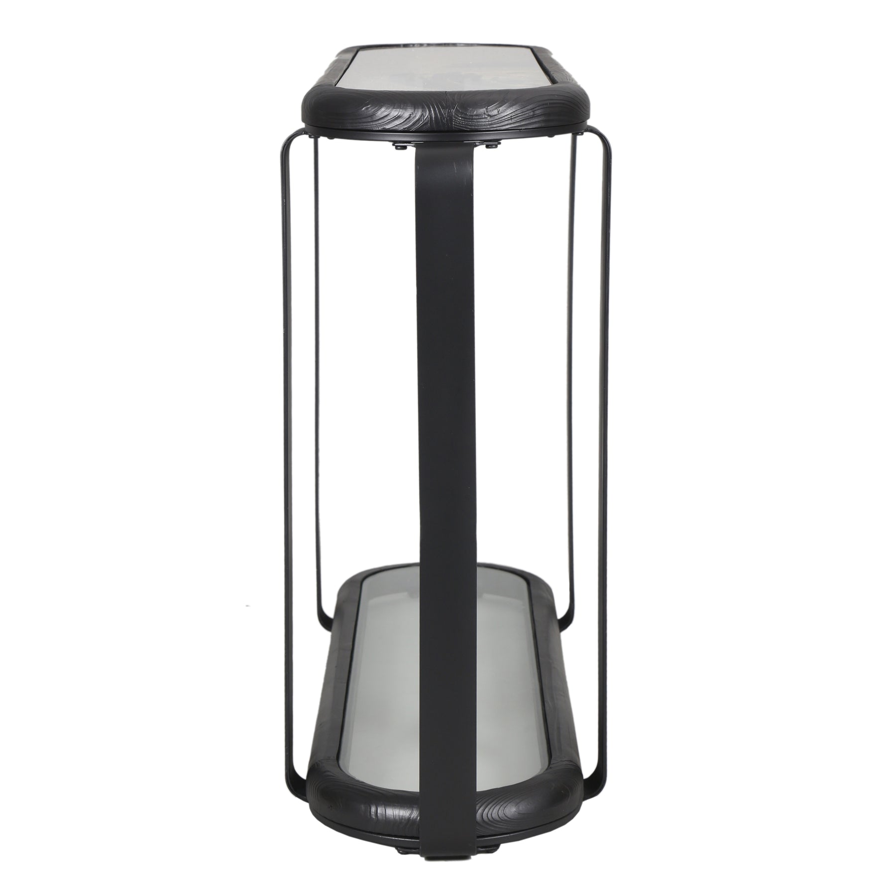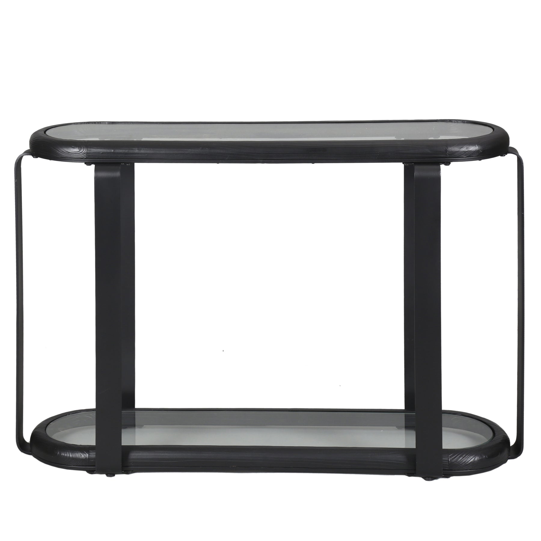 Elevate your living space with the Tyrese metal and glass console table. This striking piece showcases an elegant blend of materials and colors to complement any modern decor. The table's black frame provides a sleek contrast to the clear tempered glass, creating a stunning visual appeal that's both sophisticated and versatile. Its streamlined design integrates seamlessly into any room, whether in a welcoming entryway or as a stylish accent in your living area.