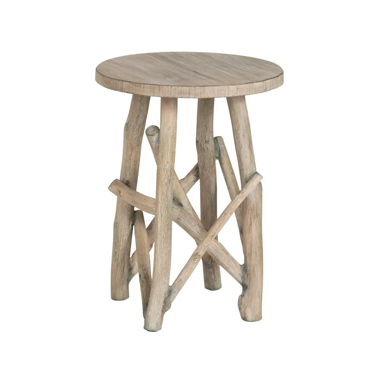 Inspired by timber trestles, criss-cross braces support a round top finished in weathered driftwood gray. The open lattice creates dramatic negative space while keeping the 18-inch table light enough to move wherever an extra perch is needed.