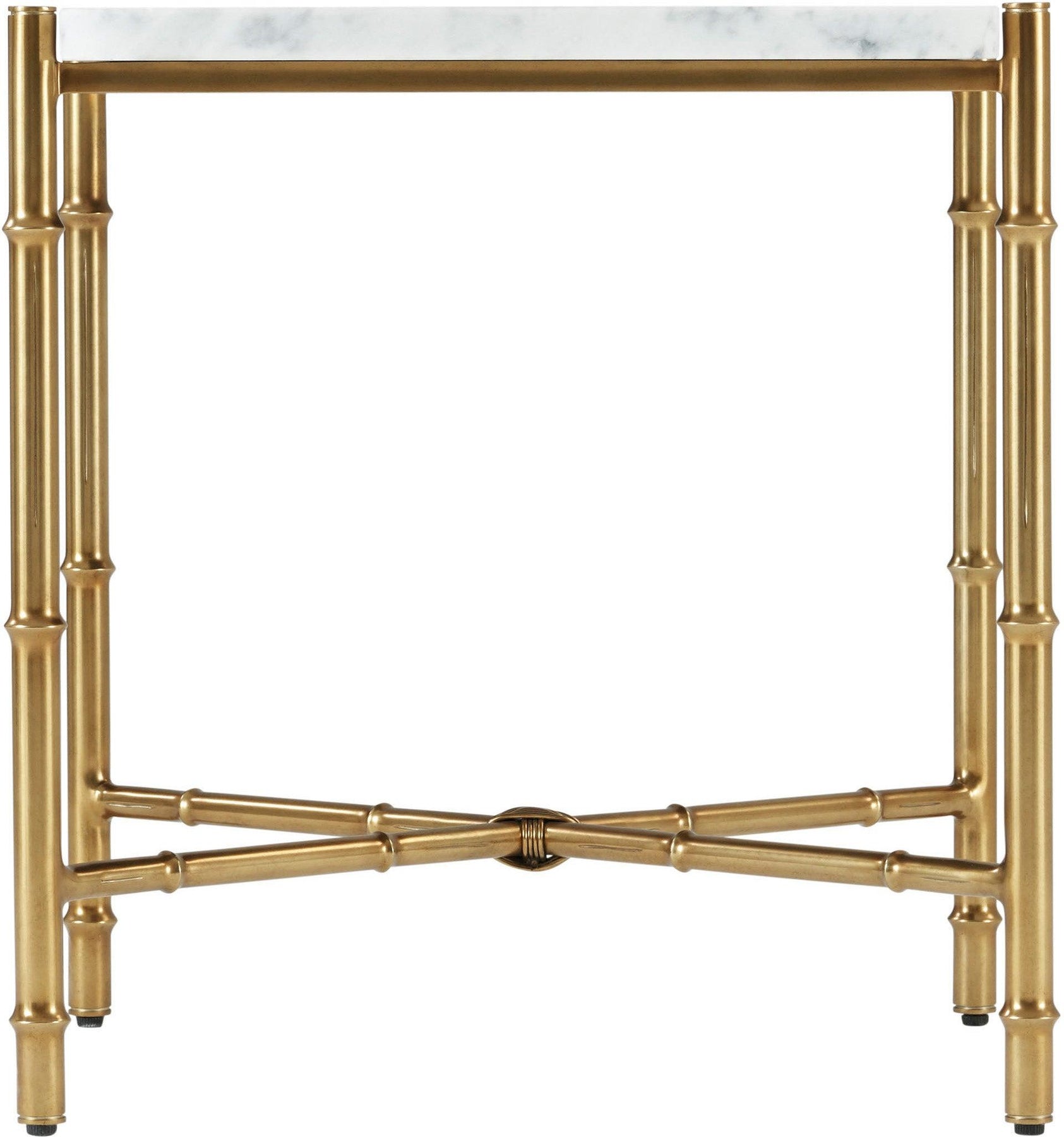 Gentle, slender lines form a light and airy design in the Kesden Side Table. A graceful combination of honed white bianco marble atop an organic base in a satin bronze finish.
