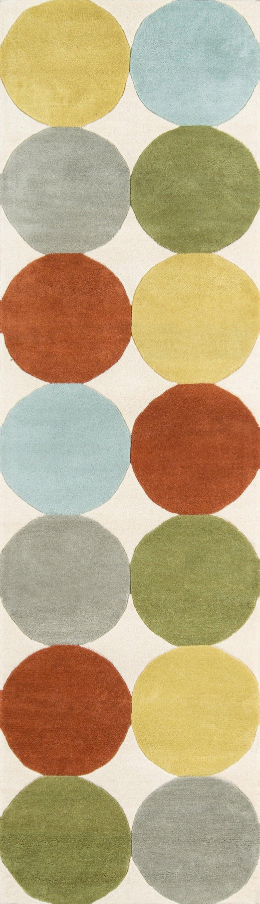 The graphic design of this modern area rug adds contemporary flair to floors throughout the home. Captured in a spectrum of vivid shades, polka dots, chevron stripes, triangulated patterns and checkerboard prints are perfect for layering above carpet or hard surfaces. Hand tufted from natural wool fibers, this decorative area rug assortment emanates fun with its oversized geometric arrangements and vibrant splashes of color.