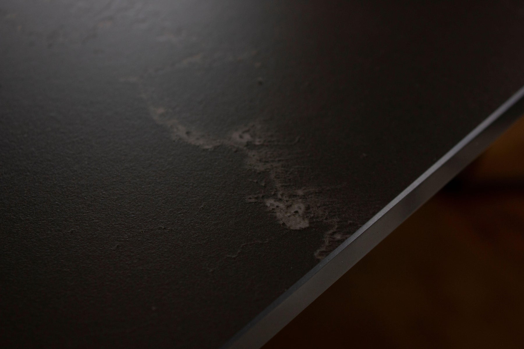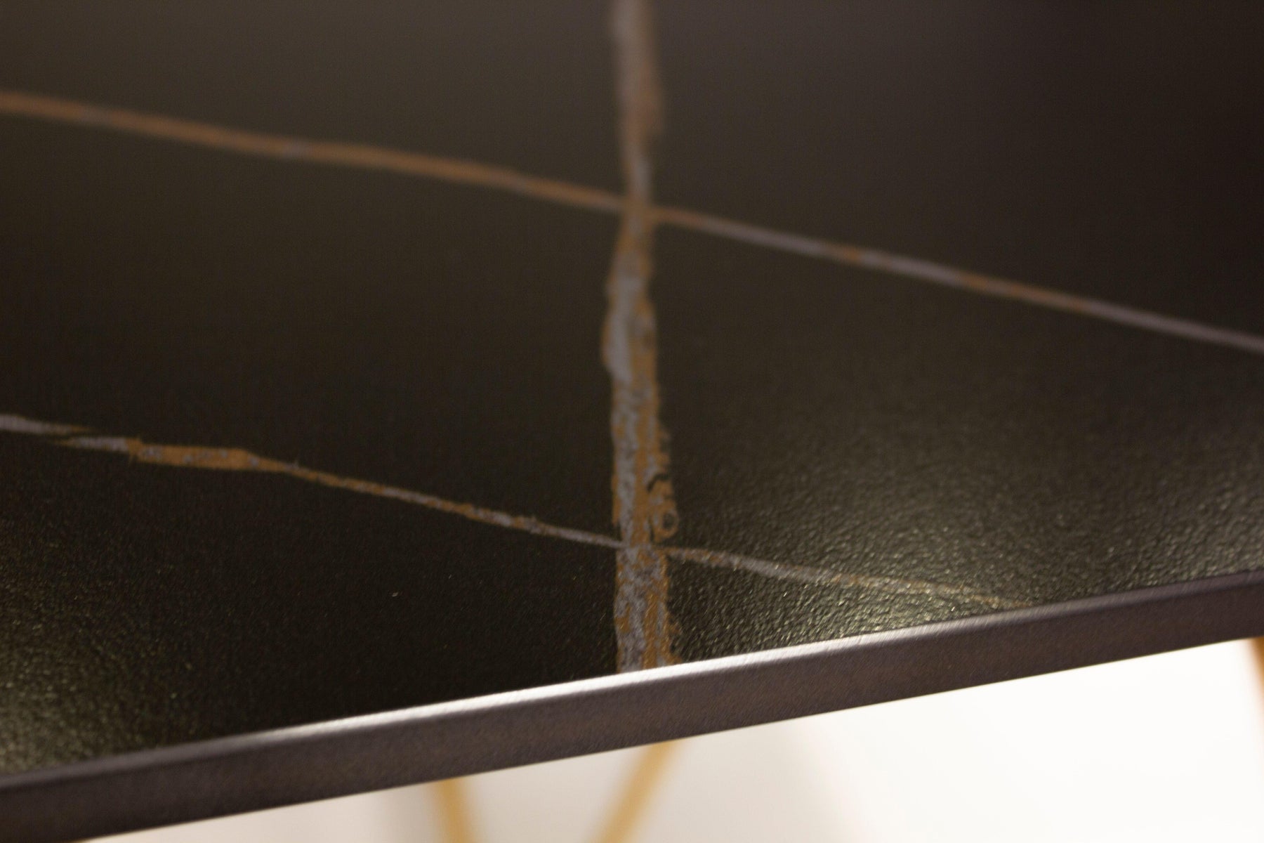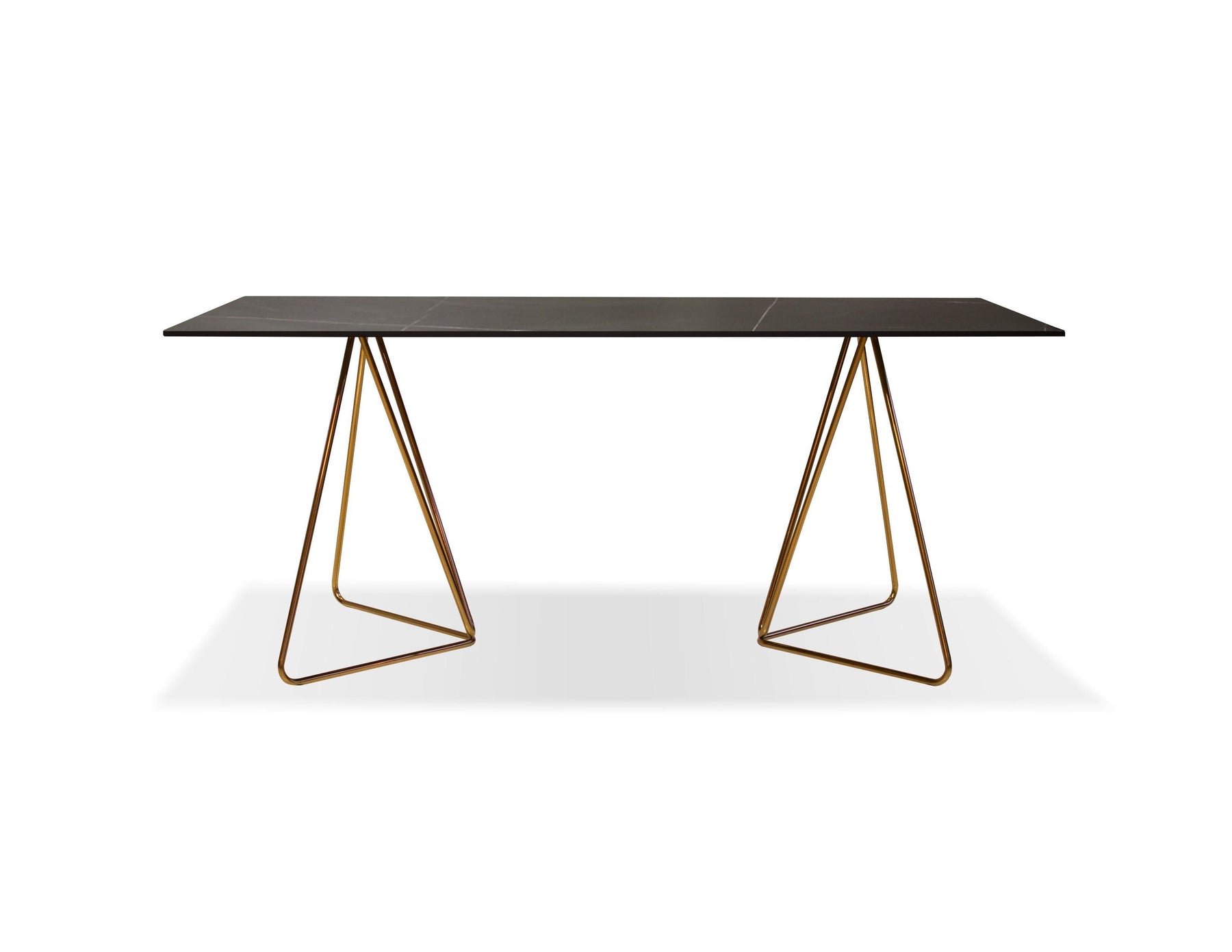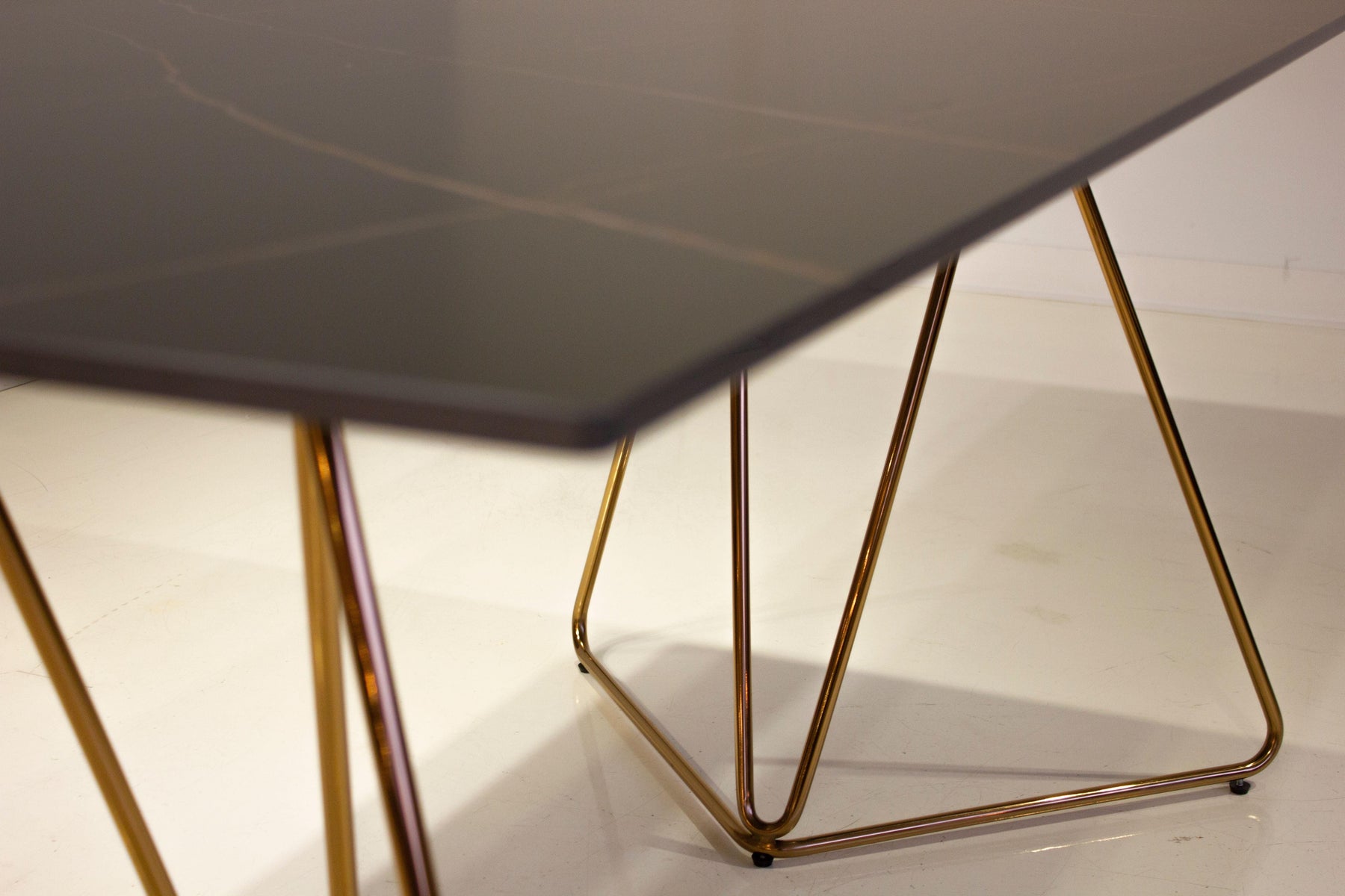 The Papillon collection, with its butterfly legs has a variety of options, from a sintered stone, strog, antibacterial marble look, to clear glass top. It frame is in powder coated back finish or in rose gold .