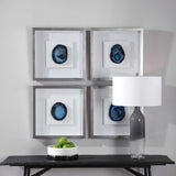 A Pine Wood Shadow Box Featuring A Hand Applied Silver Leaf Finish Showcases A Striking Blue Agate Stone With Light Blue Veining, Accented With Hand Painted Silver Edging. Mounted On A White Linen Backing.