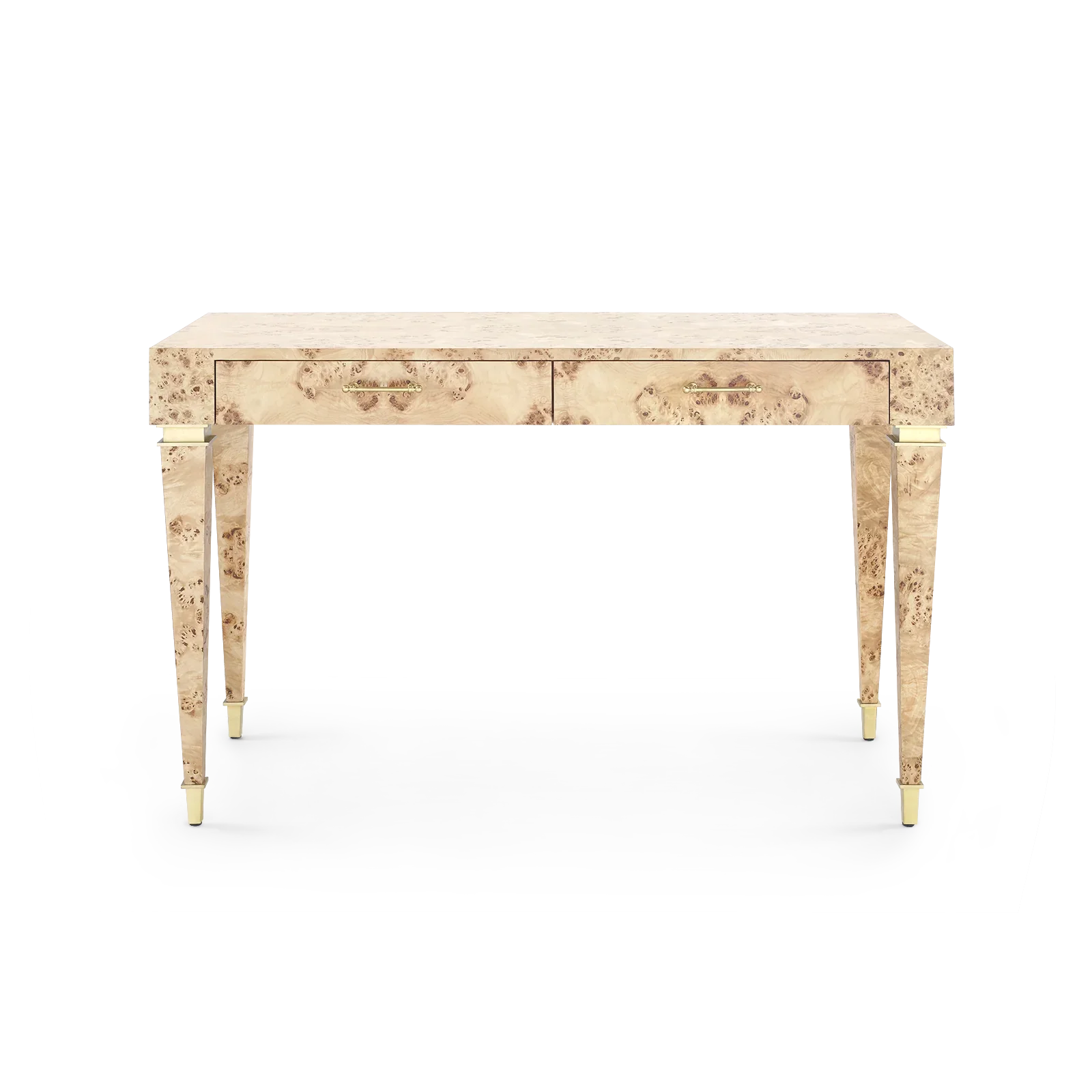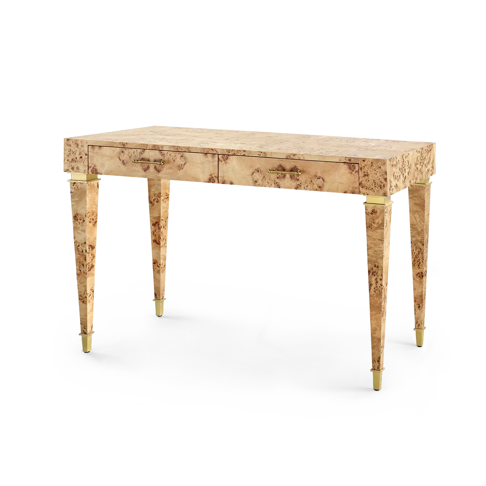 Gilded Age elegance finds a home in the Helena Desk. Its svelte silhouette is realized in a light burl wood. A smooth sheen of lacquer serves to spotlight the natural swirls and patterns of the material, giving the piece a marbleized effect. The shine of brushed brass hardware could be found in its accents, sabots, and pulls. Two slender drawers on soft-closing glides float below the top for easy access to documents or office supplies. With the Helena, working from home has never looked (or felt) so chic.