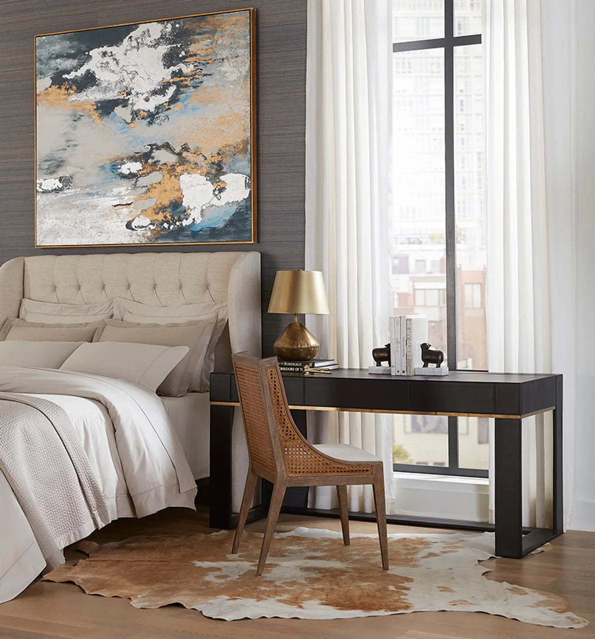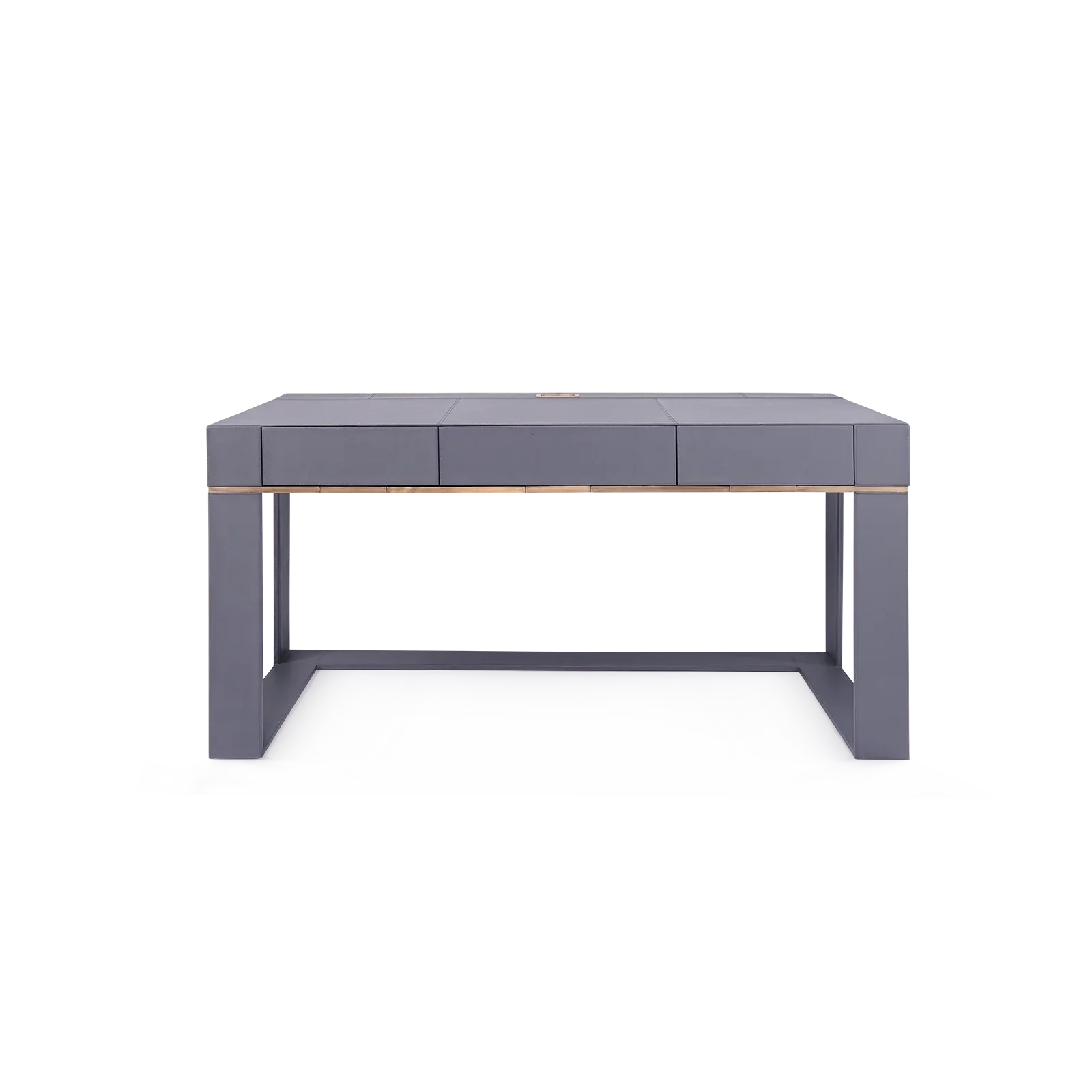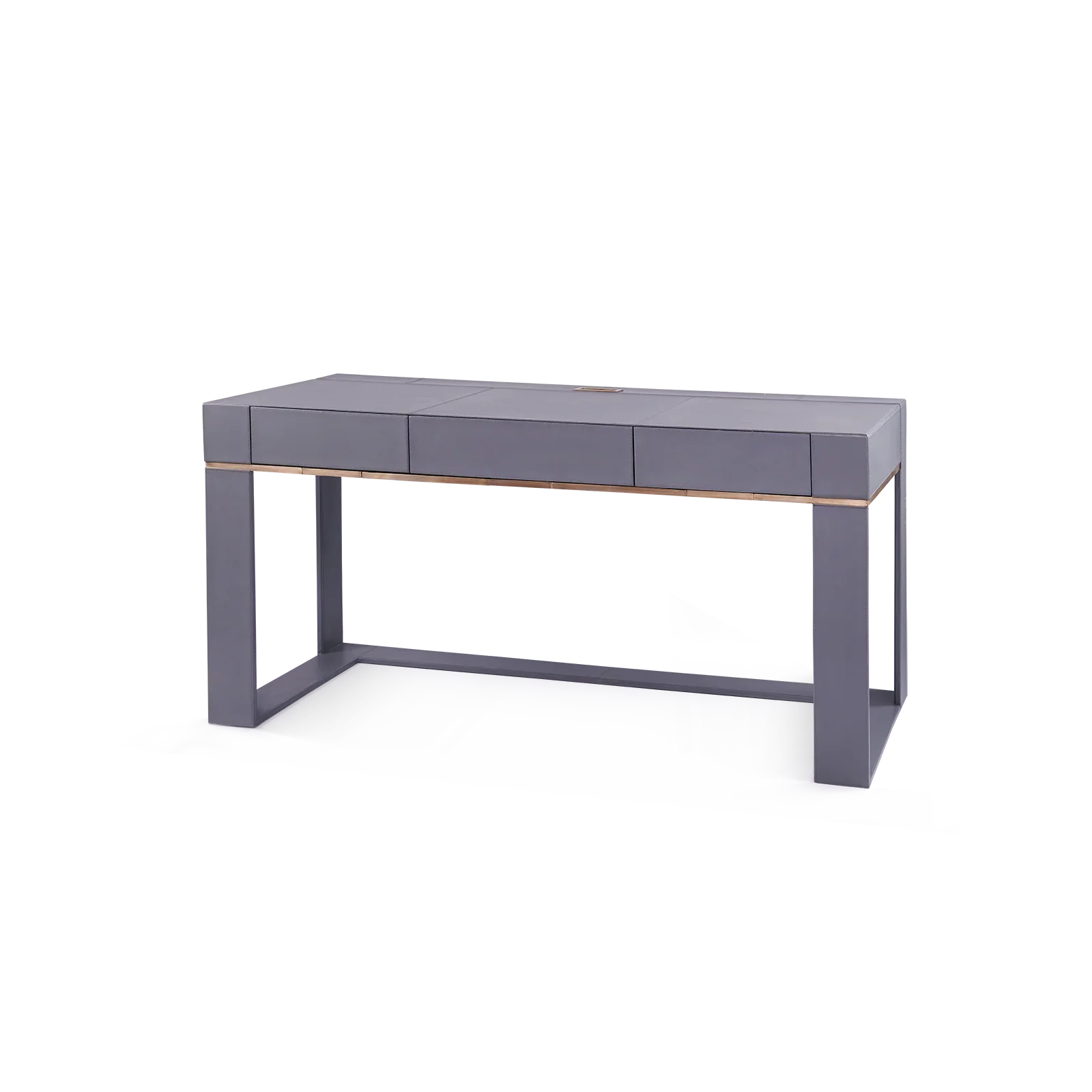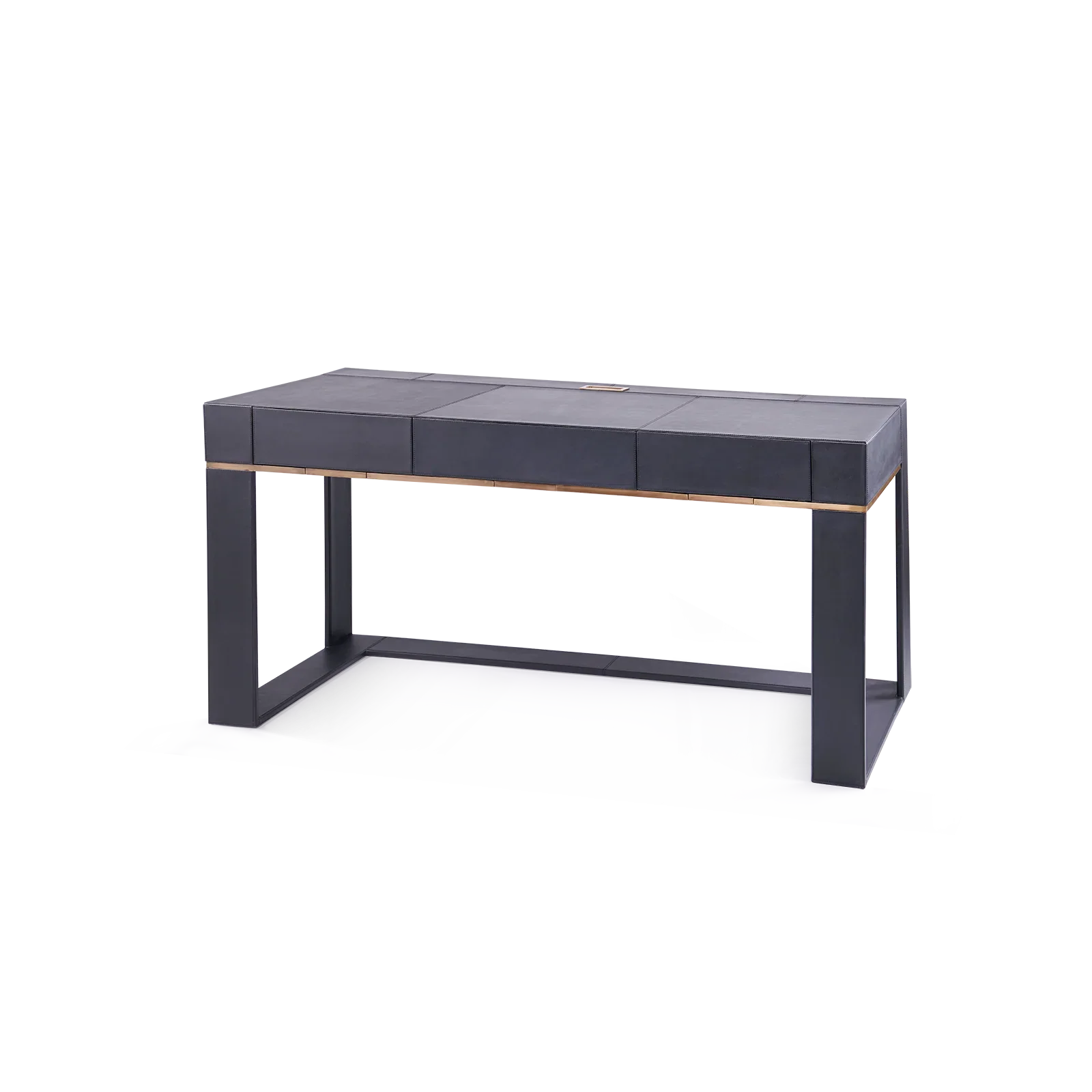 The new Landon Desk from Villa & House has a significant, masculine presence for your next home office, library, or dressing room. With thoughtful details like a convenient wire chase in the rear, micro-suede interiors on three drawers with soft-closing glides, and a masterfully hidden shelf for your surge protector or extension cords, we’ve thought of everything with the Landon. The fully-wrapped leather desk features gorgeous stitching, bronze details, and interestingly perpendicular legs. Notice the minimal pulls that seamlessly blend into the bronze wrap.