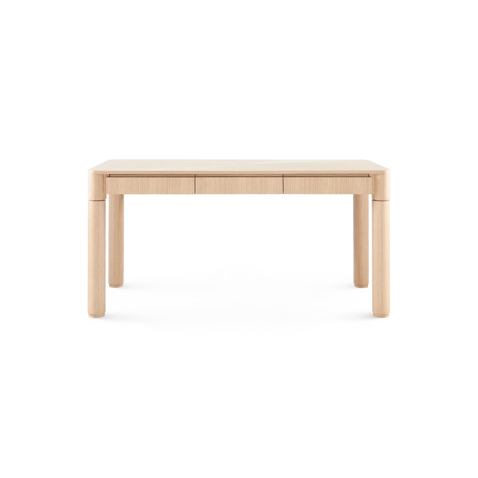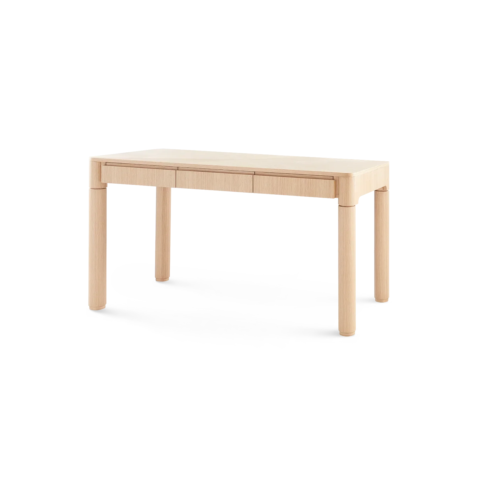 The Nolan Desk is expertly crafted from European white oak veneer with a sleek clear lacquer finish. Its bold, curved, and chunky elements draw inspiration from 1970s-80s California design, offering a retro yet refined look. The desktop features a stunning chevron wood grain pattern, adding texture and elegance. With three spacious drawers and resting on columned legs with recessed feet, blending retro charm with modern style.
