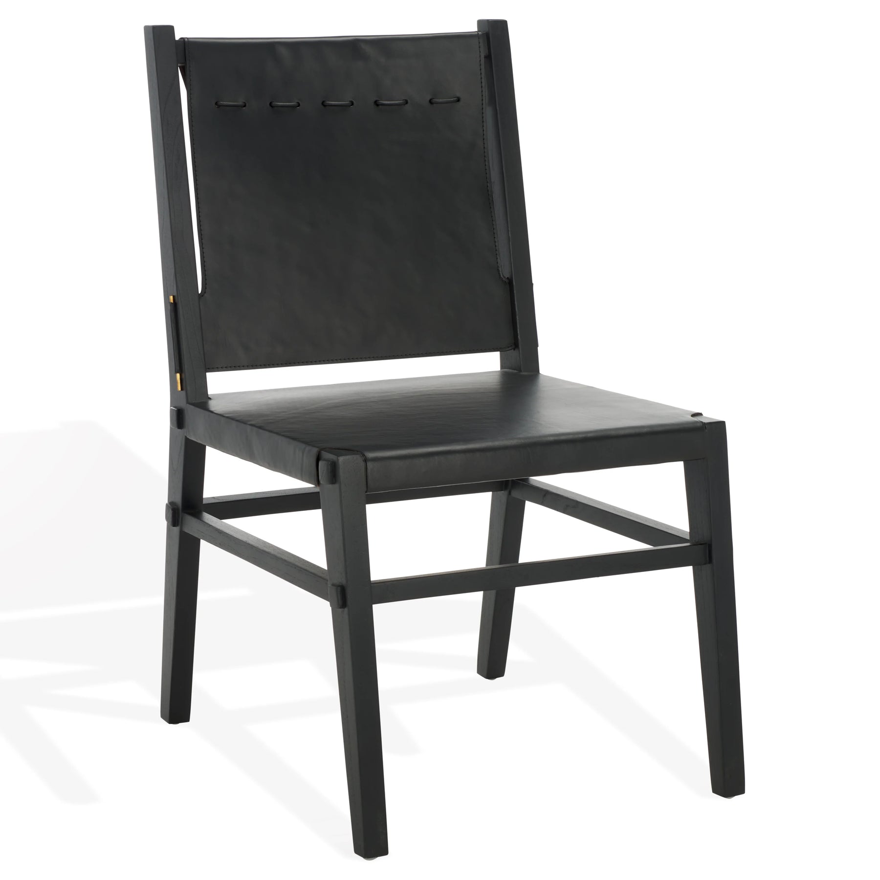 Enhance your dining space with the refined elegance of the Catriella Leather Dining Chair set of 2. Crafted from sturdy Mindi wood and highlighted with stylish brass accents, these chairs blend durability with timeless sophistication. The rich black top grain leather upholstery provides a luxurious seating experience, offering both comfort and class. Designed to complement a variety of dining tables, the Catriella chairs bring a touch of modern opulence to any setting. Make every meal an elevated experience with this beautifully crafted set of two dining chairs.