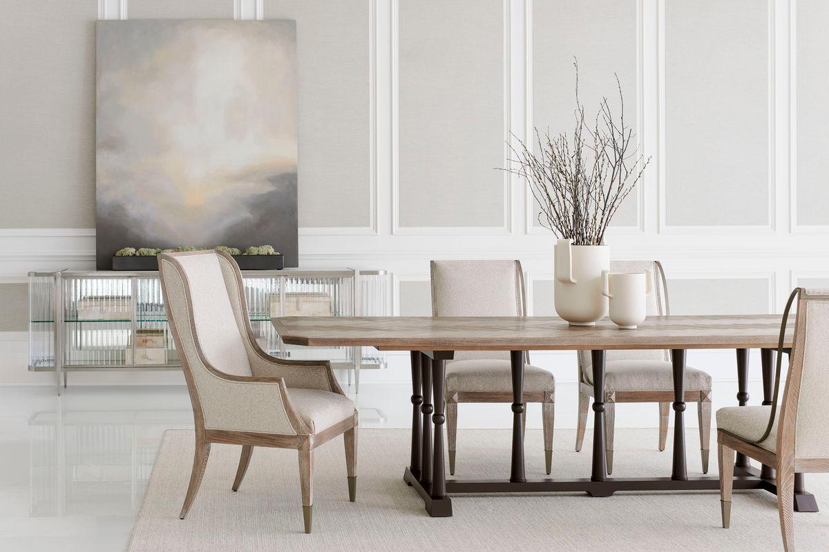 Fully upholstered chair. Legs finished in Ash Driftwood. Metal ferrules and top band trim in Sundance Gold