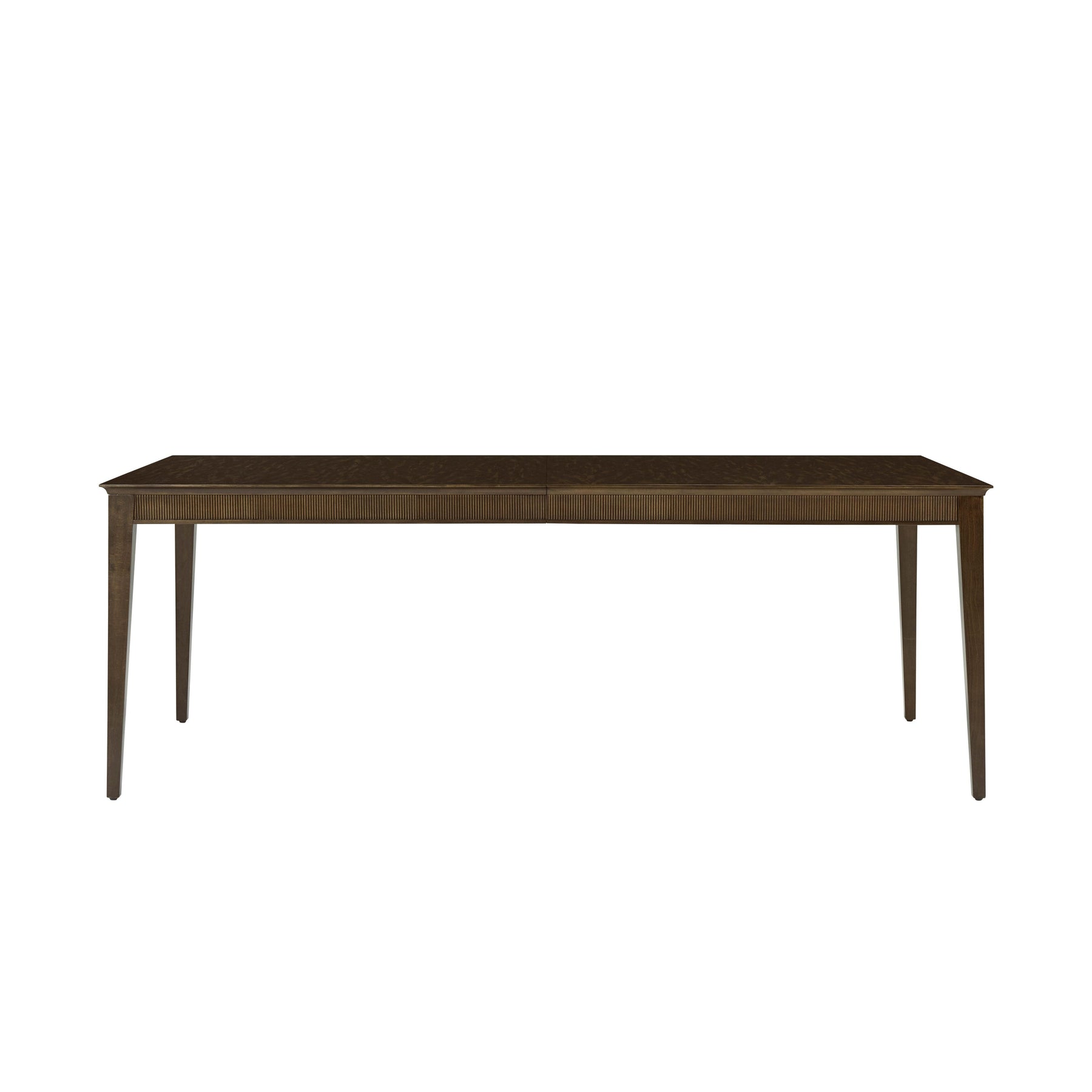 The Lido Rectangular Dining Table, crafted in a Prima Vera in our Bistre finish, features a reeded apron set upon sleek tapered legs. Includes two leaf inserts and two additional legs for a more luxurious dining experience.