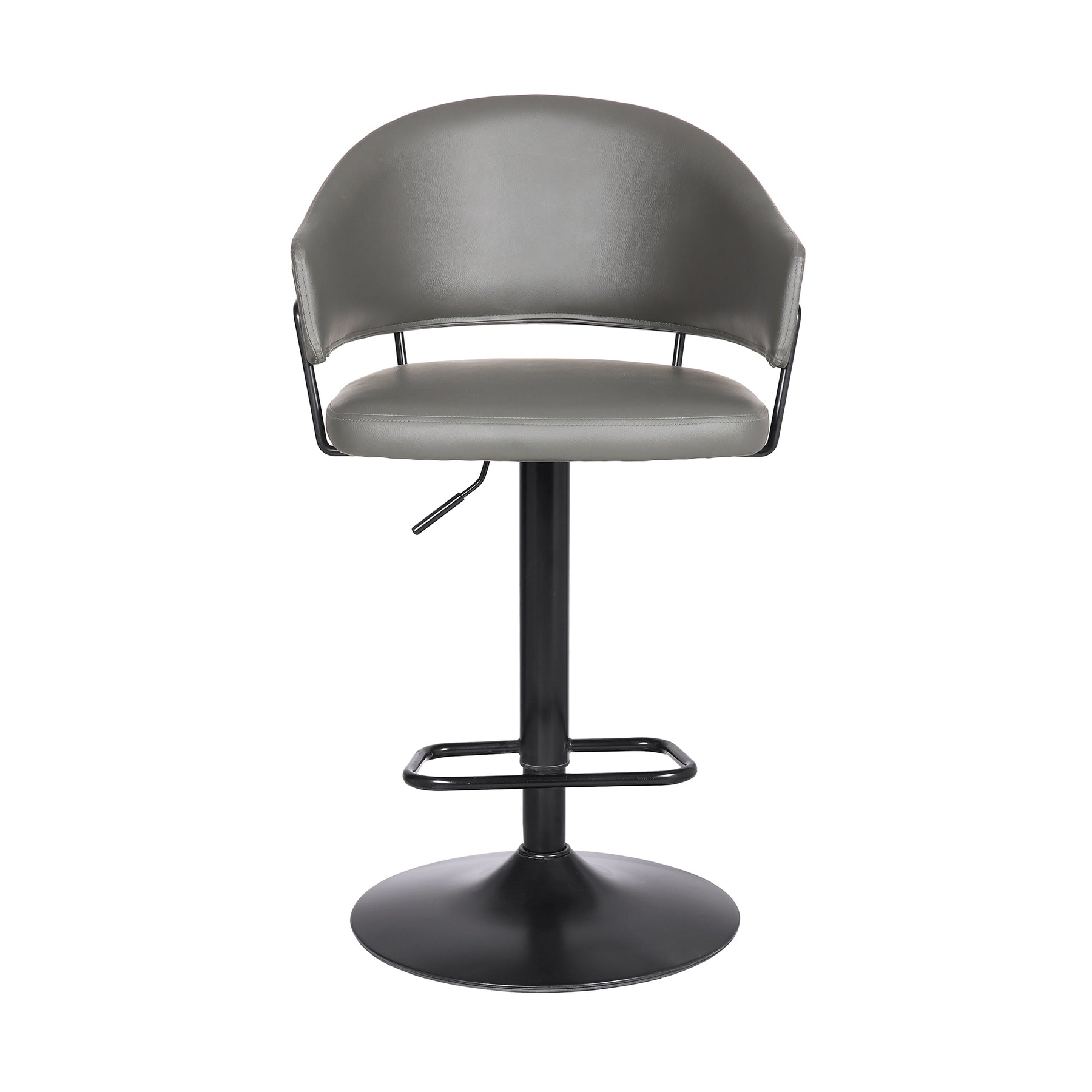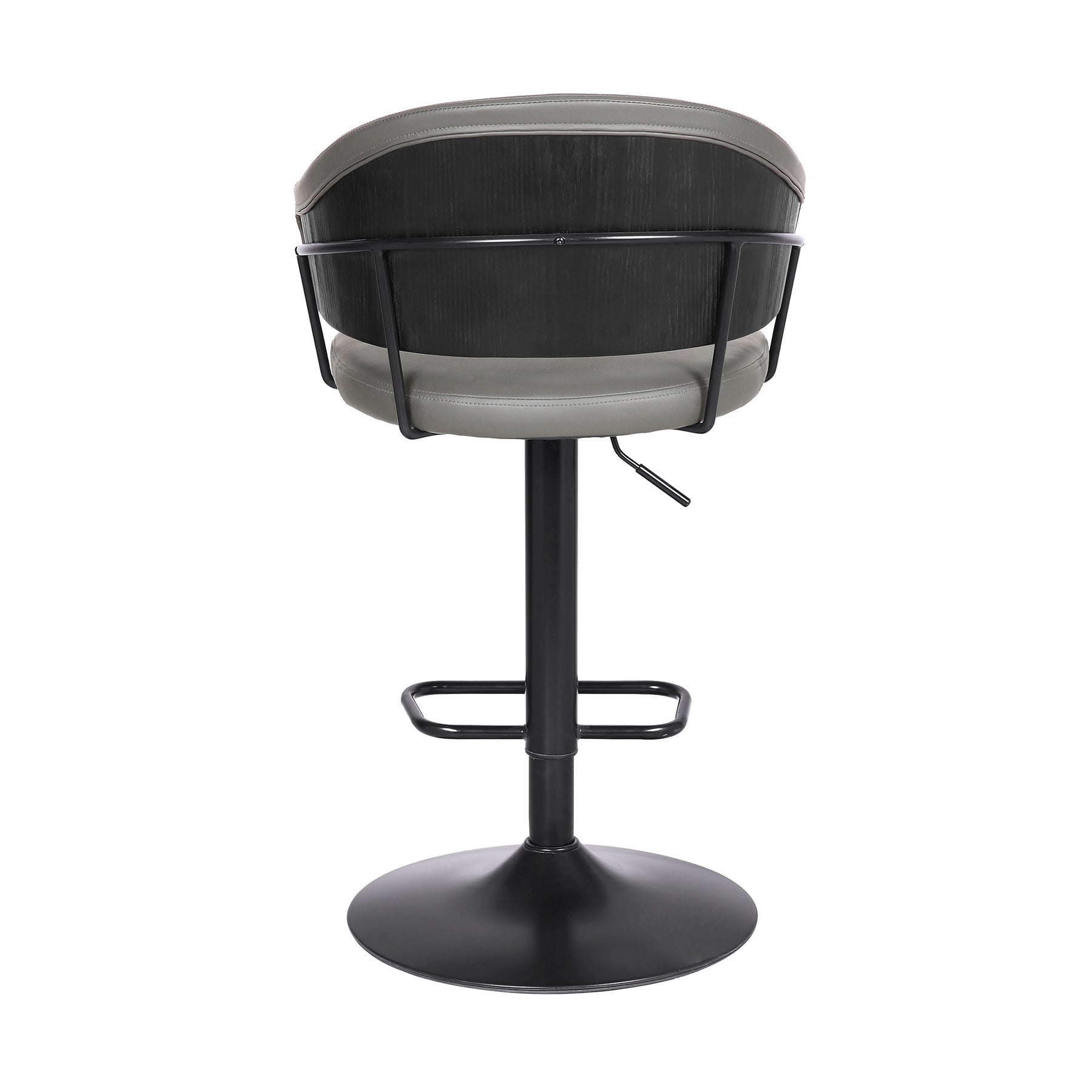 Add a touch of modern glamour to your kitchen island, peninsula counter, or home bar with the Brody Adjustable Height Swivel Gray Faux Leather and Black Wood and Metal Base Bar Stool. The Brody bar stool features a beautiful silhouette that’s sure to become a conversation piece at parties or gatherings. The rounded back and seat are cushioned with high-density foam and wrapped in beautiful gray faux leather upholstery. The opening between the seat and back allows for breathable easy seating and the metal accent brings the mixed materials together in harmony. The Brody adds convenience to your life with the adjustable seat height, full 360-degree swivel, and footrest. The swivel motion gives full mobility and you’re able to easily engage with your friends and family regardless of their place in the room! The pedestal stool base keeps you firmly planted in one place while the faux leather upholstery makes cleanup a breeze! This kitchen stool is functional, stylish, and comes with a black metal base and accents as well as a black brushed wood back and gray faux leather upholstery.