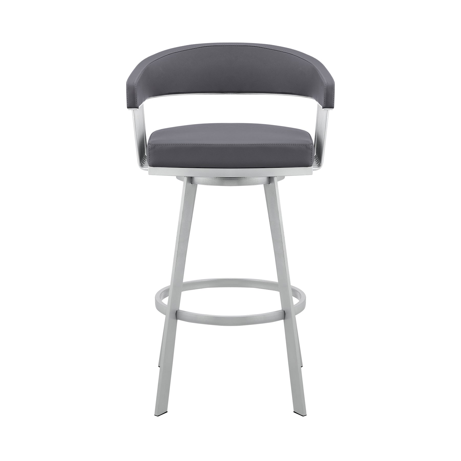 Bring the Bronson Swivel Bar Stool from Armen Living into your beautiful home! It is the best choice to bring in another seating option and does so without compromising on comfortability. The wonderful faux leather and stainless-steel accents give the Bronson a look of refinement, making you proud to show it off in your home. The foam-padded seat cushion offers you the most comfort available to you! This curved open-back stool will keep you relaxed while enjoying dinner with your friends and family. The Bronson also features a convenient metal footrest, for additional support and stability. This stool comes in your color choice of Black, Gray, and White faux leather. It is also available in your choice of 25" counter height and 29" bar height.