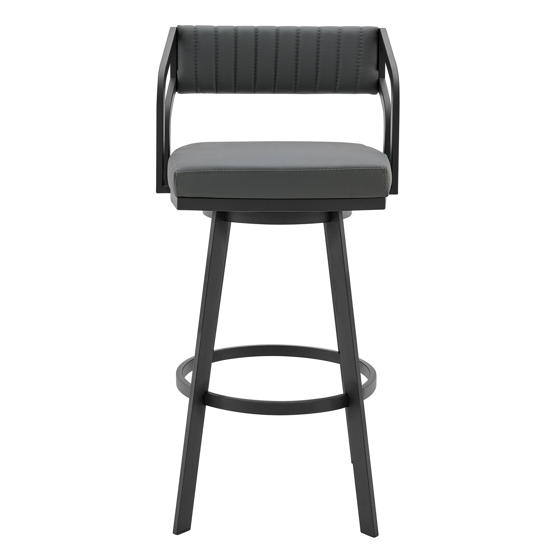 Add a modern furniture piece to your home with the Capri Swivel Modern Metal and Faux Leather Bar and Counter Height Stool. The Capri is a unique design that will be sure to start conversations at all your gatherings. Pull the Capri up to your kitchen island, counter, peninsula, bar, or pub table with ease due to the unique low arm design that allows you to sit as closely to your desired surface as needed. The Capri modern style silhouette is perfectly complemented by its channel style stitching on the back piece, the back of the Capri's open-lower back design allows for cool breathable seating. Enjoy full mobility with the 360-degree swivel function that keeps you fully engaged with guests on all sides of the room. The Capri Swivel Modern Metal and Faux Leather Bar and Counter Height Stool is available in your choice of a Matte Black or Brushed Stainless Steel finish and beautiful slate Gray faux leather and comes in a Bar 30" height or a Counter 26" height.