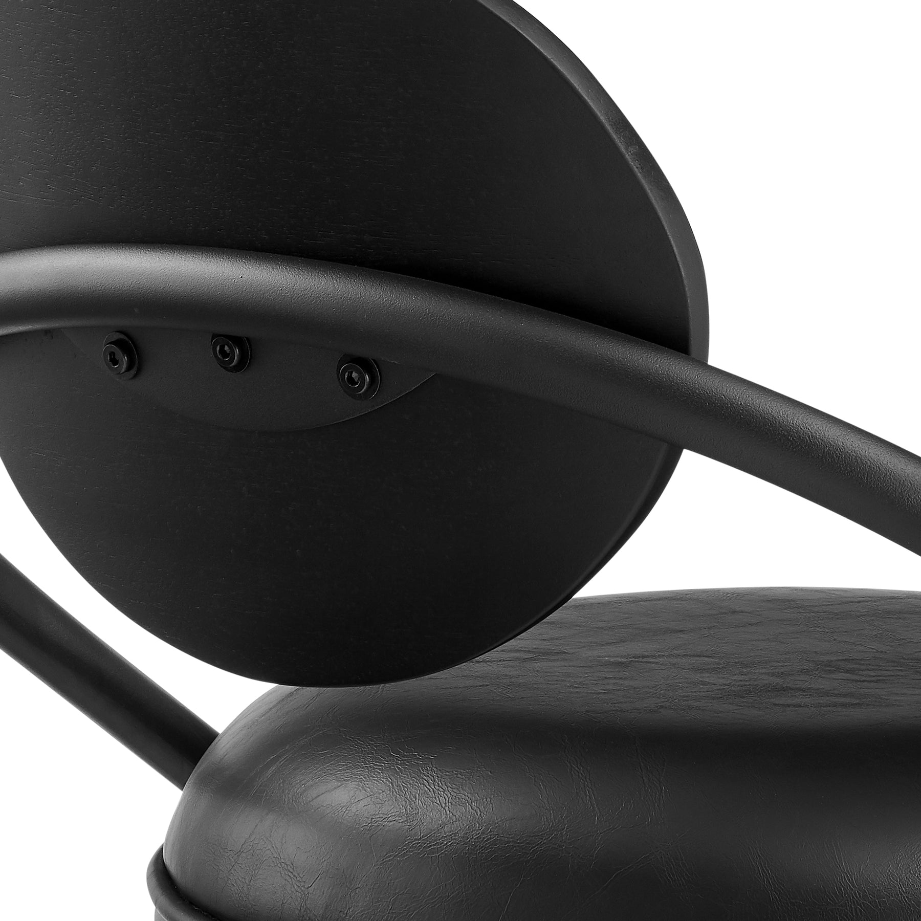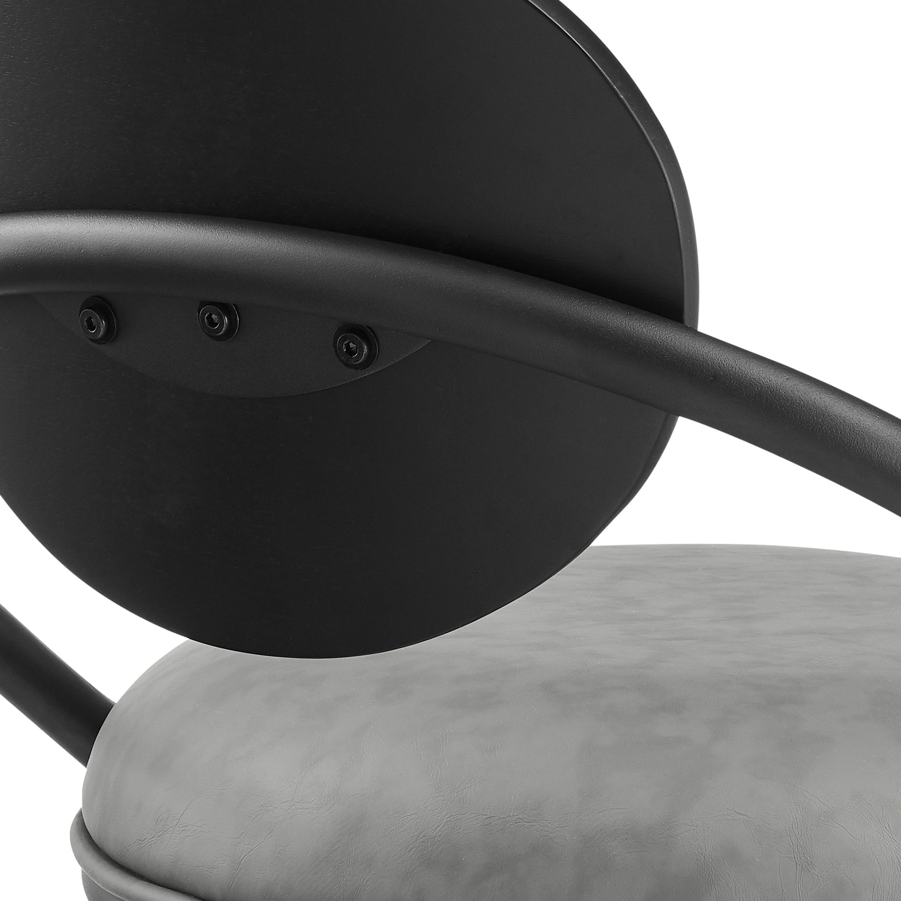 Give a chic and stylish update to any room with the Carnation Swivel Counter or Bar Height Stool in Metal and Faux Leather by Armen Living. Our barstool's bold geometry and minimalistic design create a subtle but striking profile. Its eye-catching circular back and refined hugging profile offer a chic and modern look. This counter stool includes a generously padded foam cushion covered in sumptuous faux leather. Faux leather does not crack easily, and it is stain and water-resistant to offer easy care and maintenance. Elevated by sleek, tapered legs, our barstool serves as a sturdy and attractive seating option anywhere from your kitchen to your home office. It can stylishly pull up to your kitchen island, pub table, home bar, or adjustable desk. This barstool includes a built-in circular footrest to provide an exceptionally comfortable seating experience. The smooth 360-degree swivel function allows you to change direction and follow conversations with optimal precision and convenience. The Carnation Swivel Counter or Bar Height Stool is available in Black Iron with Vintage Gray or Vintage Black Faux Leather to give the perfect upgrade to your home.