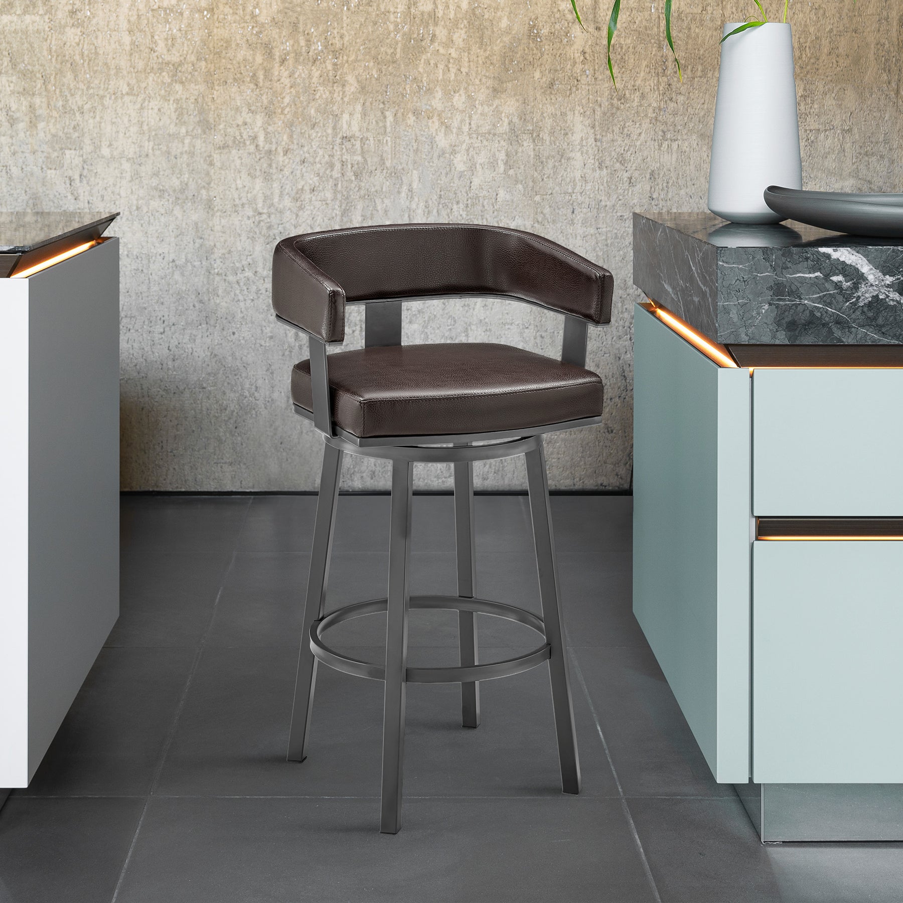 The modern and contemporary Cohen Counter or Bar Height Swivel Bar Stool in Metal and Faux Leather is simplicity and refinement placed into one item. The high-quality faux leather upholstery is flawlessly wrapped around the seat and back, while the upholstery on the seat covers the incredibly soft, high-density foam-padded cushion. The metal frame of this barstool is built with durability and sturdiness in mind, giving you years of enjoyment. The contemporary round silhouette is unlike most bar stools and includes a wide, open-lower back design for cool breathable seating. The incorporated round footrest is an extra feature added to give you maximum comfort. The legs are tipped with rubber caps to prevent scratching or sliding on floors and help keep you home in pristine condition. The versatile look of the Cohen allows it to blend into any room in your home, from your kitchen island or pub table to even an adjustable desk. It also features a full 360-degree smooth gliding swivel chair function, providing maximum mobility and allowing you to change directions with ease. The Cohen bar stool is available in your choice of: Brushed Stainless Steel with Black, Gray, or White faux leather / Black finish with Black or Gray faux leather / Java finish with Chocolate faux leather / Silver finish with White faux leather.