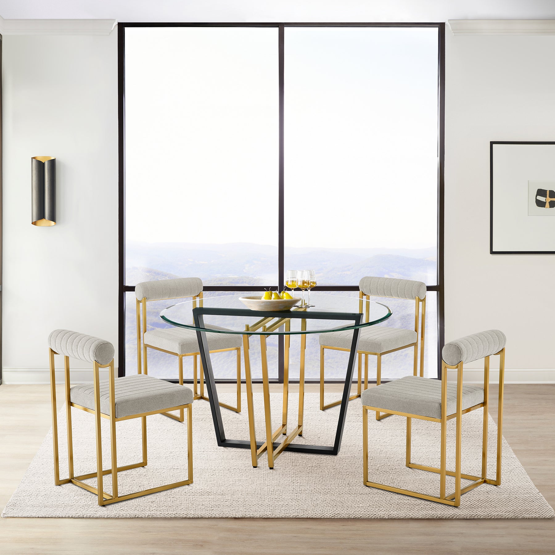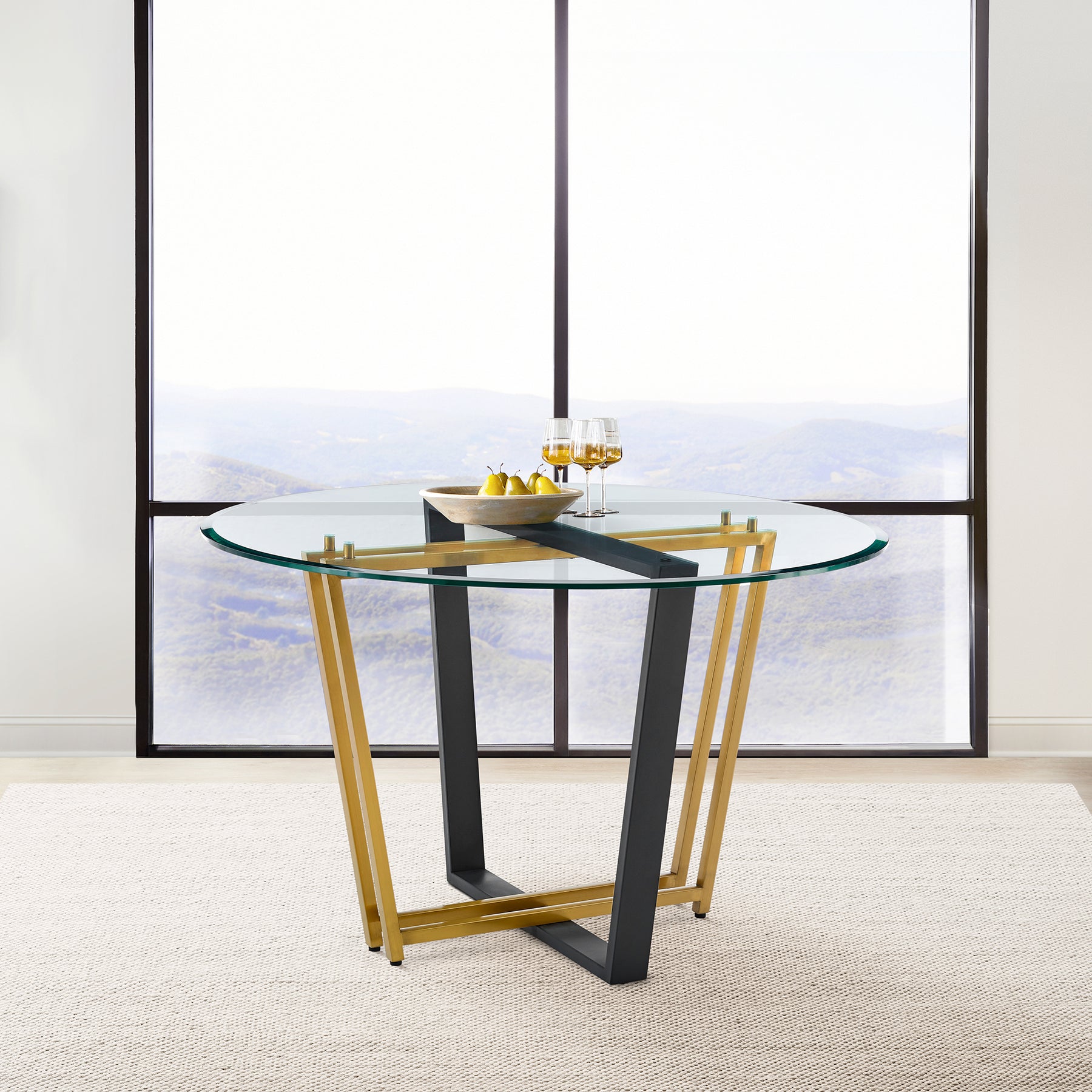 Update your dining space with the luxe charm and elegance of the Devi Round Dining Table with a Glass top and Metal base by Armen Living. Mixed materials and contrasting finishes lend a refined touch to this captivating dining table. Its round, glass top gracefully floats atop its streamlined, geometric base. The metallic base is accented with angles and bold finishes to evoke the polish and drama characteristic of a contemporary showstopper. Bringing sophisticated drama to your home, our dining table serves as a stunning addition to your kitchen, dining room, or living space. Its round shape creates a timeless and elegant silhouette, inviting your friends and family to gather and enjoy. With a diameter of 48", the Devi table can comfortably seat up to 4 people, and it offers a perfect spot to enjoy intimate dinners and family gatherings. The sturdy construction ensures longevity and provides a reliable, easy-to-clean surface for meals and more. The Devi Round Dining Table is available in a Glass tabletop and Black Iron base with Brushed Stainless Steel or Gold Stainless Steel finish to bring effortless sophistication to your dining space.