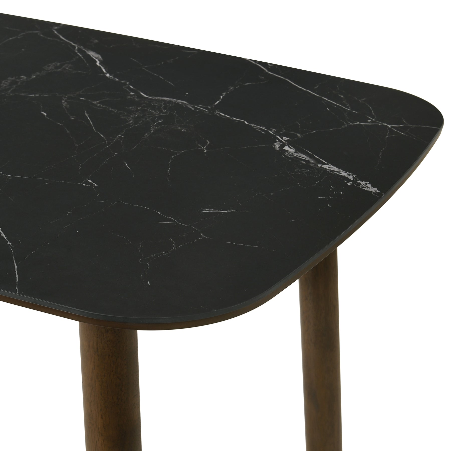 Emorie Mid-Century Modern 71 in. Rectangle Wood Dining Table in Walnut Finish with Sintered Stone Top from the Emorie collection offers a stunning balance of minimalist style and durable function. Designed with clean, mid-century modern lines and thoughtful material selection, this table becomes an instant focal point in any dining room. At the center of its design is a sintered stone tabletop, an advanced surface that combines the look of natural stone with exceptional resistance to heat, stains, and scratches. The sleek finish is complemented by a solid rubberwood base, finished in a warm walnut tone that adds richness and grounding contrast to the stone surface. This pairing of materials brings both visual depth and practical longevity, making it ideal for everyday meals as well as special gatherings. Measuring 71 inches in length, the Emorie table comfortably seats six and works equally well in open dining areas or more intimate spaces. Its understated silhouette and neutral palette allow it to mix effortlessly with upholstered or wood chairs, adapting to both modern and transitional interiors. Assembly is quick and straightforward, requiring about 5 minutes with two people. Backed by a 1-year manufacturer’s warranty for added confidence. Bold yet refined, this table invites relaxed elegance and meaningful connection into your daily dining experience.