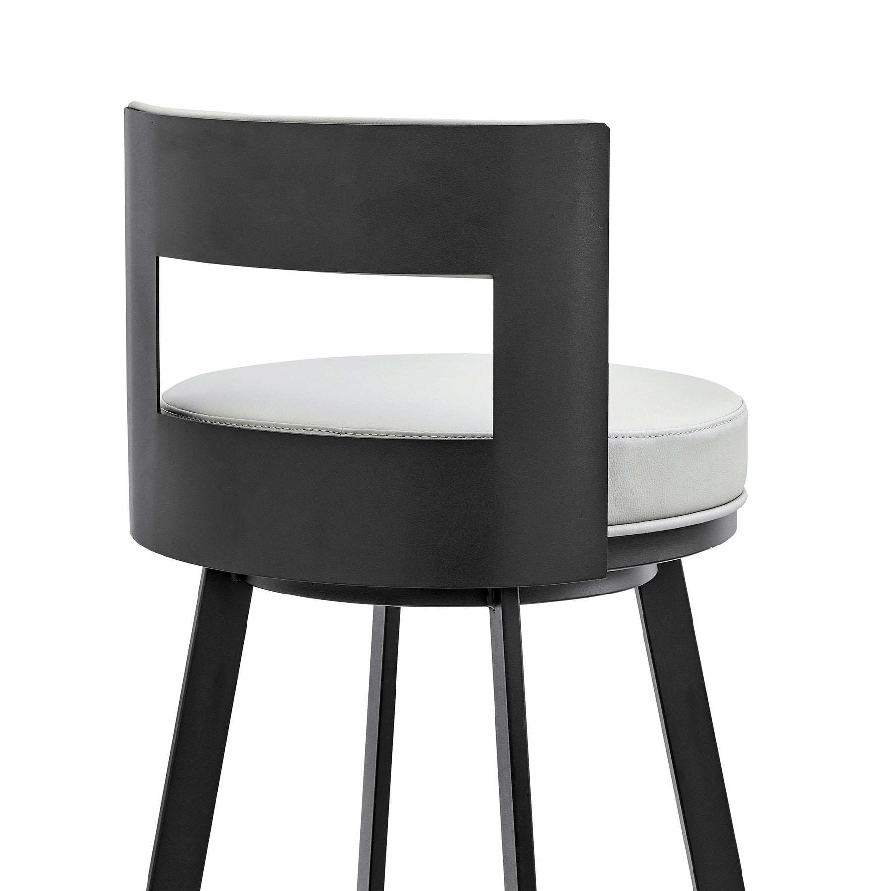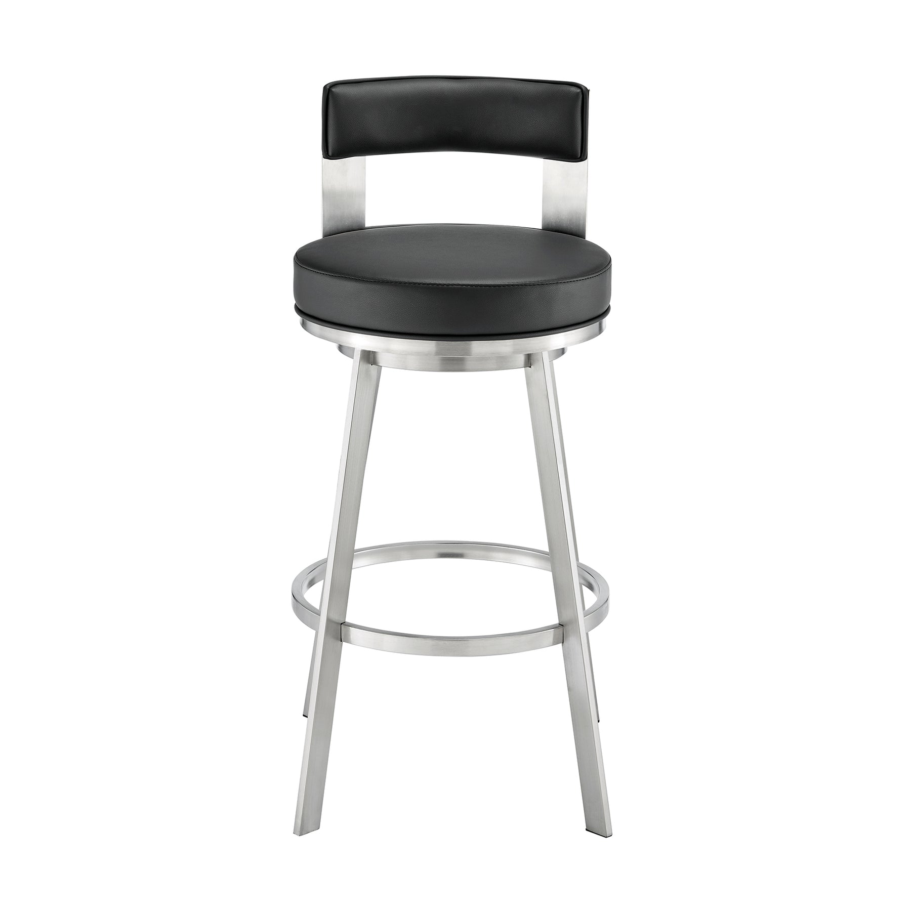Modernize your home with the Flynn swivel bar stool or counter height stool by Armen Living. The Flynn features a metal 4-leg base and durable faux leather upholstery. Faux leather is known for its resistance to cracking, staining, fading, and UV damage, ensuring longevity. Counter height or bar stools with a swivel chair mechanism offer added convenience for daily use and entertaining. The full 360-degree swivel chair function provides maximum mobility, and the smooth glide swivel allows you to change directions effortlessly, making this your new favorite seat. This modern stool has an open back that creates a breathable seat, allowing you to sit comfortably for extended periods. The modern counter stool features a chic and streamlined profile with a subtly curved back. Complemented by a roomy, round, cushioned seat, our thoughtfully designed counter stool provides support in all the right places. The Flynn is available in various finishes and faux leather upholstery options, including a black finish with light gray faux leather, brushed stainless-steel finish with black, white, or light gray faux leather, brown finish with chocolate faux leather, or silver with gray faux leather upholstery. Choose between 26-inch seat height or 30-inch seat height options to best suit your space.
