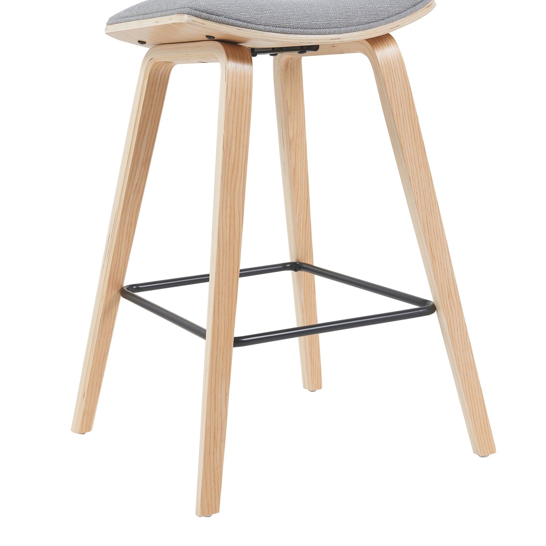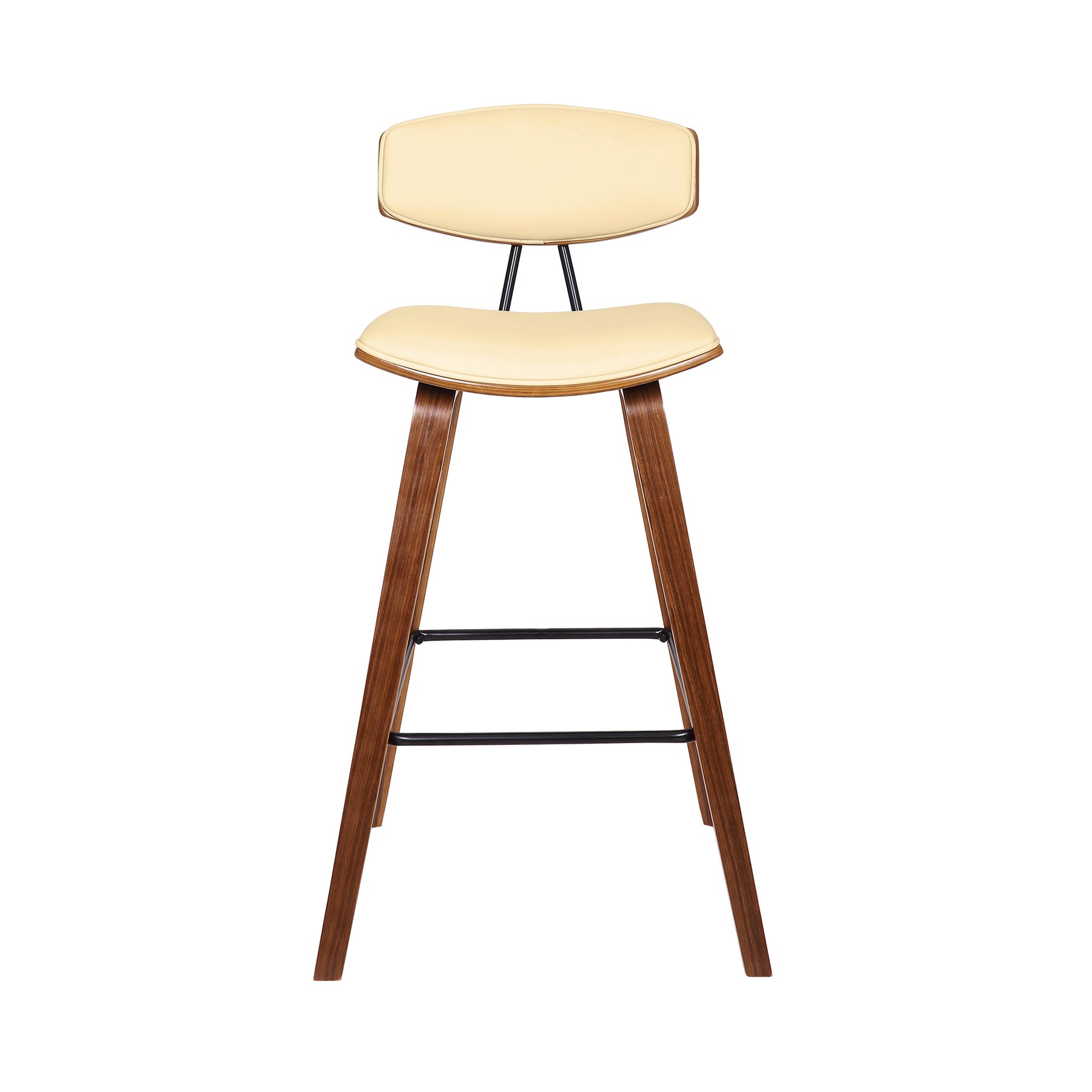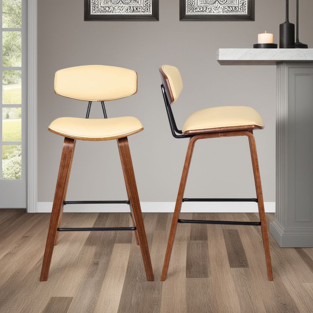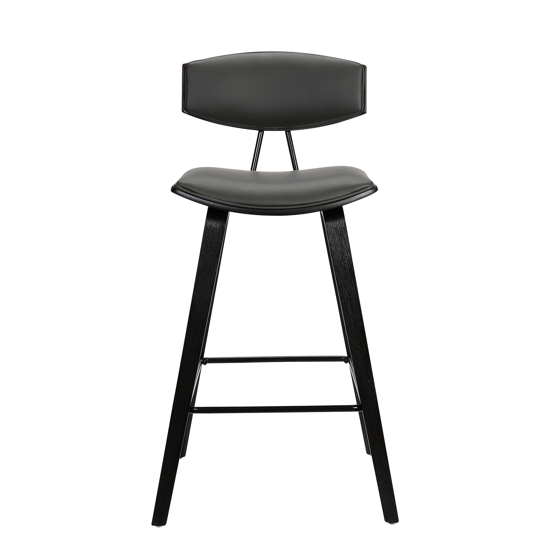 Whether drawn up to a sleek kitchen island for a breakfast nook or rounding out your home bar with a perfect perch, a bar stool like this is a versatile seating solution with sleek modern style. The Armen Living Fox 28.5" Bar Height Black Faux Leather and Black Wood Mid-Century Modern Bar Stool is a sophisticated and functional modern piece certain to enhance the aesthetic of any style home or apartment. The high-density foam cushioned back, and seat will allow endless hours of entertaining or lounging. The curved wood medium high back with padded support is ideal for posture alignment and an unmatched support for days on end. The foundation of the product is supported by wood and steel footrest for a chic and stylish aesthetic without comprising practicality and functionality of this item. The Mid-Century Modern style silhouette gives you a timeless look with the durability to last for many years to come. Available in your choice of a 25.5” or 28.5” seat height, you can easily incorporate this stool into your kitchen, dining room, home bar, or office! The Fox Faux Leather and Wood Bar Stool is available in your choice of a black wood finish with black or gray faux leather upholstery or a walnut wood finish with cream, brown, or gray faux leather upholstery.