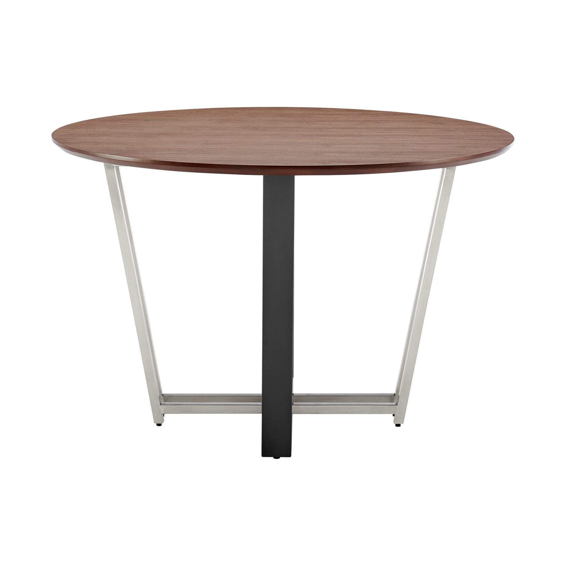 Elevate your space with the refined charm and polish of the Joana Round Dining Table featuring a Walnut top and Metal base by Armen Living. The clever design and compelling combination of materials bring eye-catching sophistication to this contemporary dining table. Its round tabletop features a classic walnut veneer to showcase the rich finish and natural textures of the wood. It is perched upon a clean-lined, angular base to offer a sleek and modern design. Showcasing contrasting metal finishes, the Joana dining table offers a refined touch of luxury, and it serves as a chic and versatile addition anywhere from your eat-in kitchens to dining and living spaces. The round shape creates the perfect space for enjoying dinners and socializing. With a diameter of 48", our round dining table can comfortably seat up to 4 people. Our table is crafted from durable and easy-to-clean materials to offer a reliable and low maintenance surface for enjoying dinners, conversations, and more. Available with a Walnut tabletop and Black Iron base, with either Brushed Stainless Steel or Gold Stainless Steel as an accent finish, the Joana Round Dining Table anchors your space with a dose of class and timeless elegance.