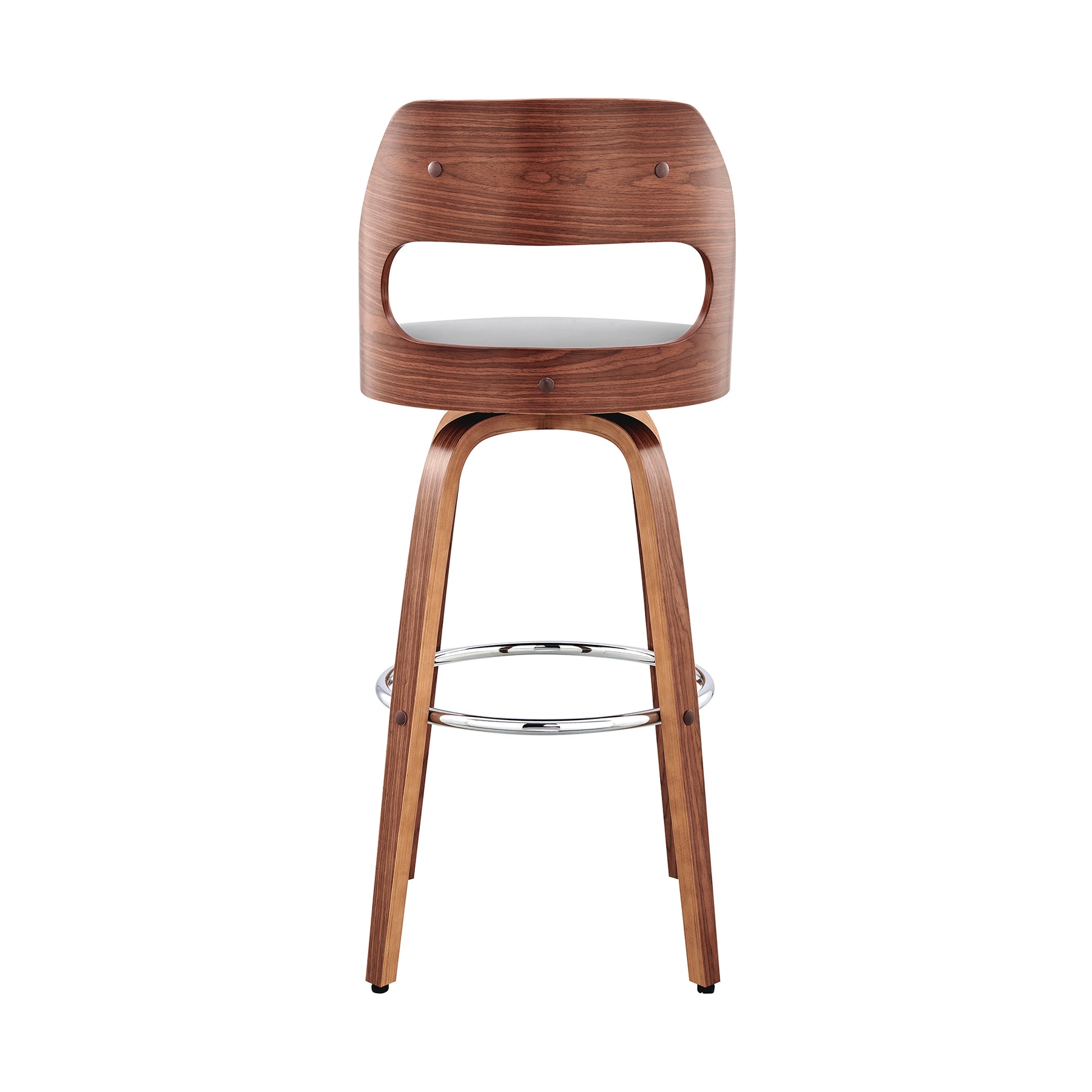 The Julius 26" Brown Faux Leather and Walnut Wood Bar Stool from Armen Living is the perfect stool to introduce into your already beautiful home. The Julius features a swivel function that allows you to turn 360-degrees, offered for your convenience! The open seat back and wide seat cushion gives you exceptional room and comfort. The Julius frame is crafted to be stable, sturdy, and, strong - also designed with a built-in metal footrest! The Julius is available in your color choice of Gray, cream, or brown faux leather with walnut wood or Gray faux leather with black wood. Product Dimensions: W:18 x D:19 x H:37 x SH:26
