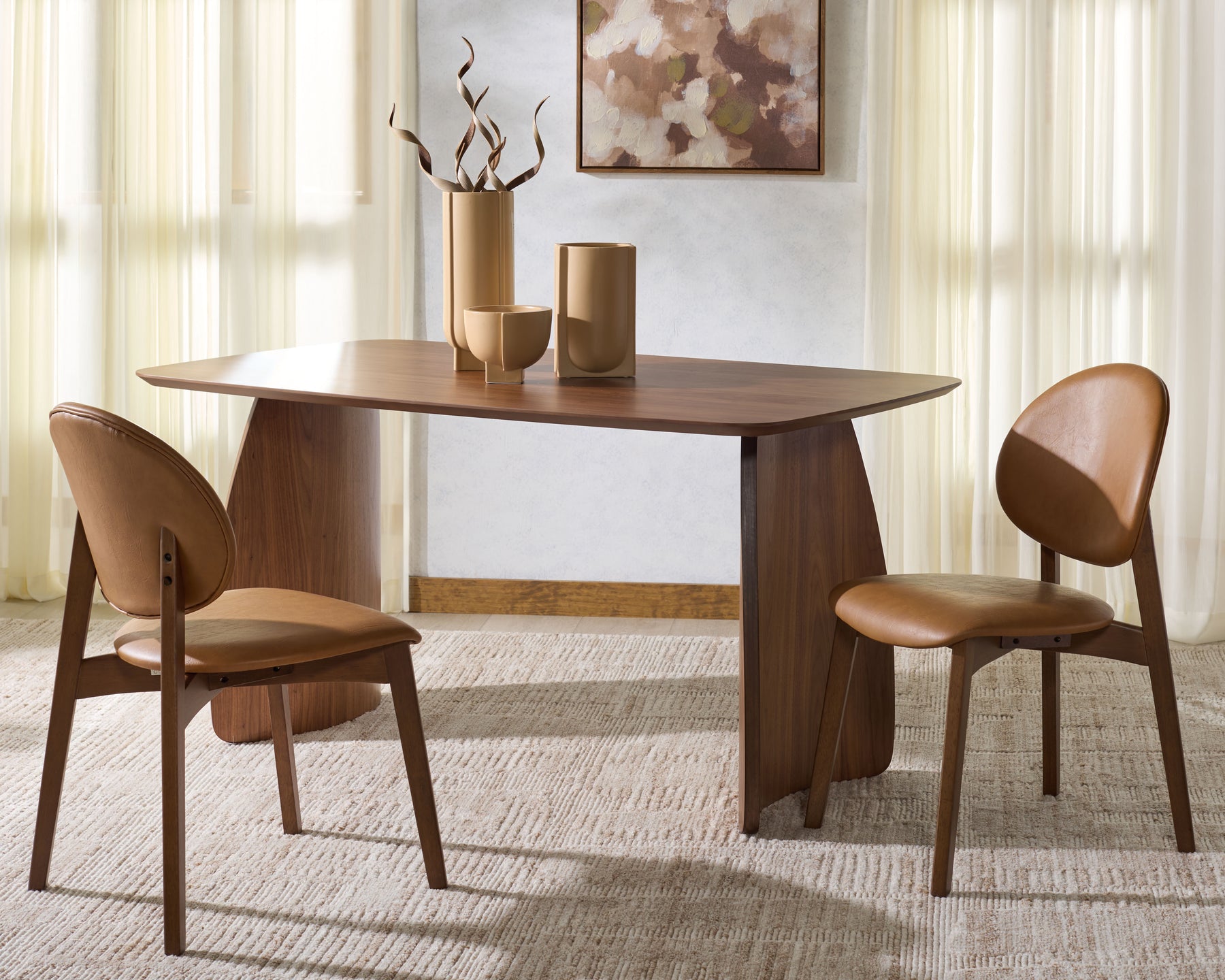 Elevate your dining experience with the Kayleen wood and vegan leather dining chair in walnut and brown. Designed to harmonize style and function, this chair offers a warm and inviting appeal to your space. The walnut brown color adds a sophisticated touch, while the blend of materials ensures comfort. The chair is composed of 10 percent wood, 30 percent fabric, and 60 percent foam, offering soft seating and a supportive back. Its sleek lines and minimalist design make it a versatile addition to any decor. Perfect for entertaining guests or enjoying a cozy meal, the Kayleen dining chair is a tasteful choice for your home. Create memorable dining moments with the blend of elegance and modern simplicity found in this exceptional chair. Transform your dining area with a piece that complements your style, inviting conversation and comfort.