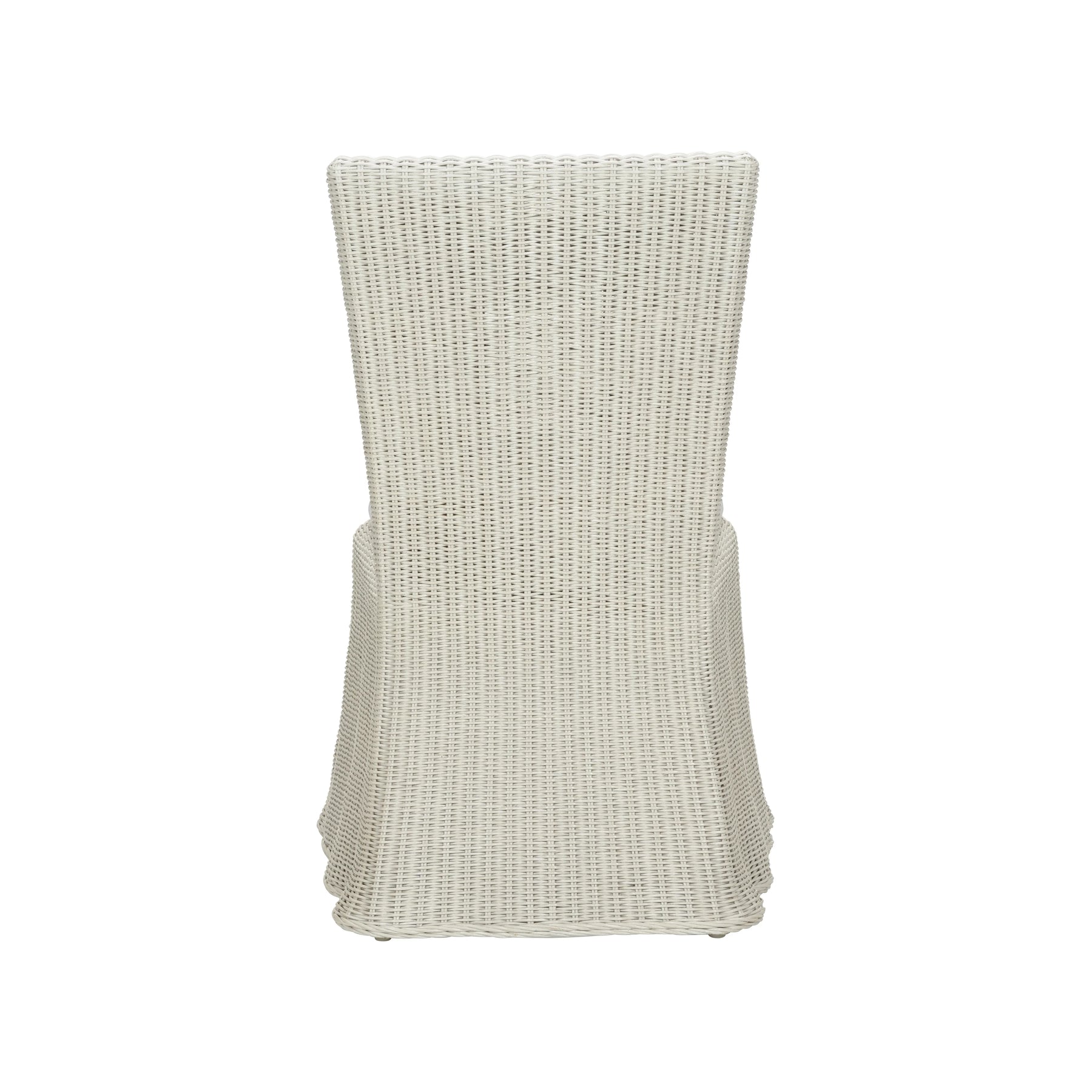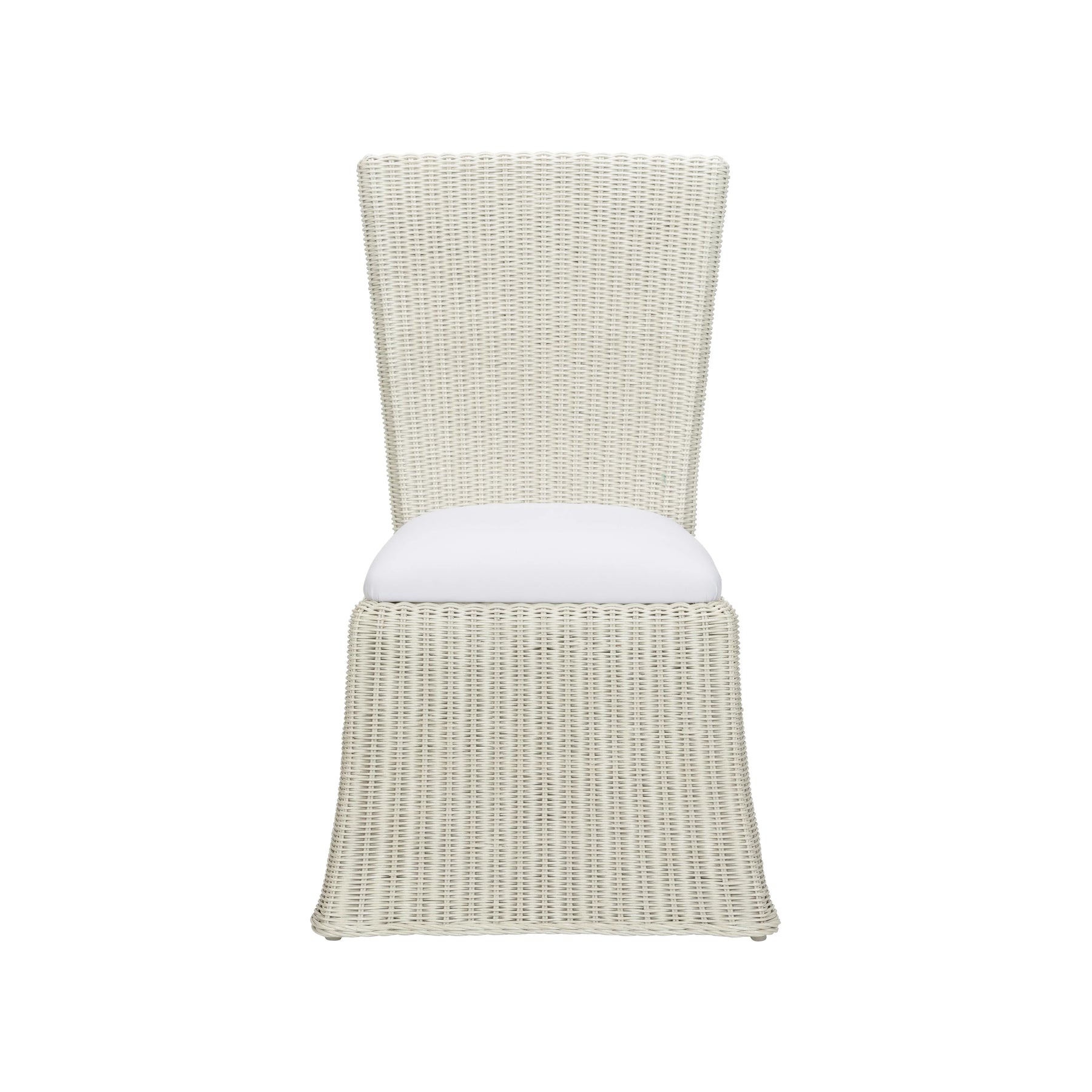 Inspired by ocean waves, the Savannah Dining Chair flows beautifully in a waterfront environment. Handwoven in whitewash wicker with white fabric cushion.