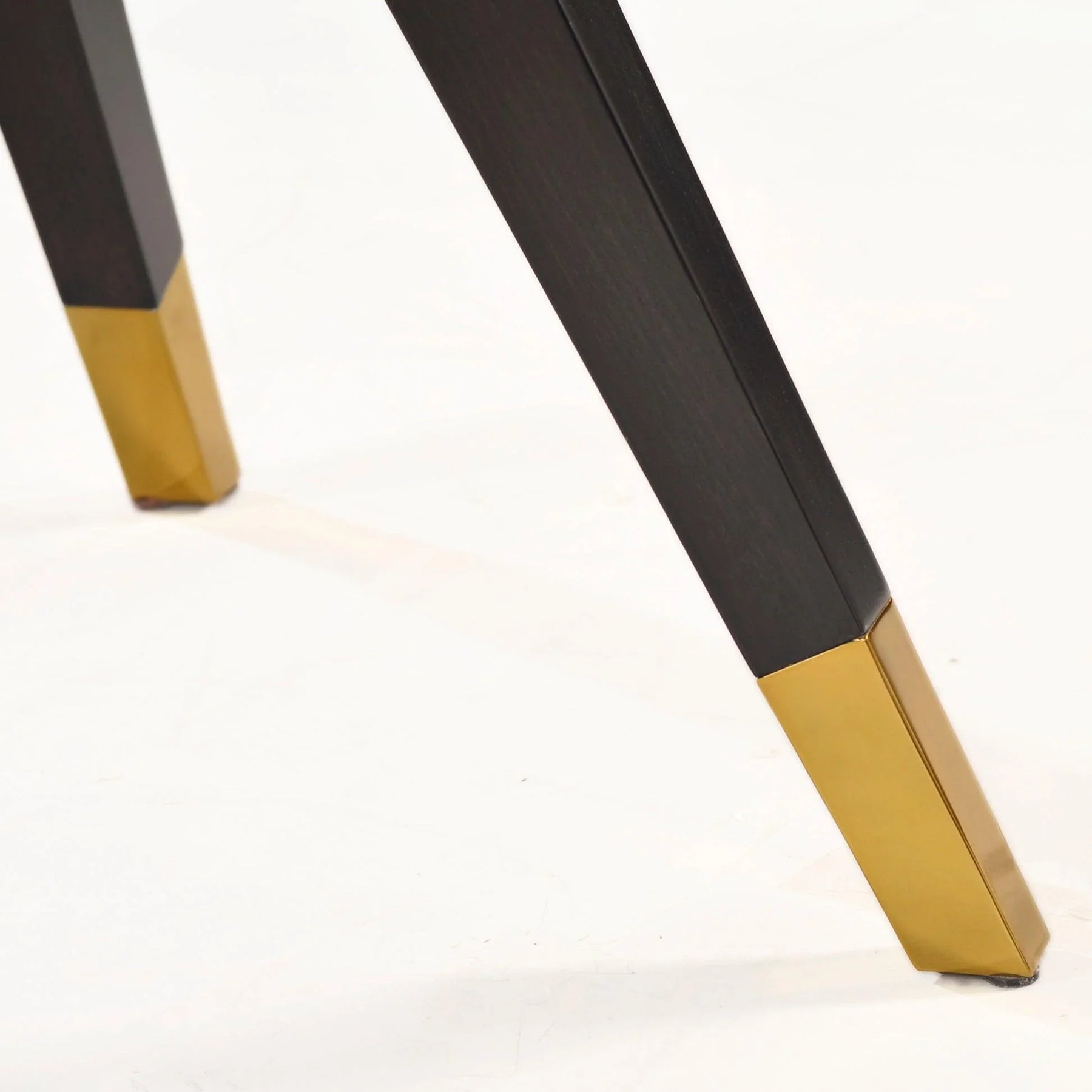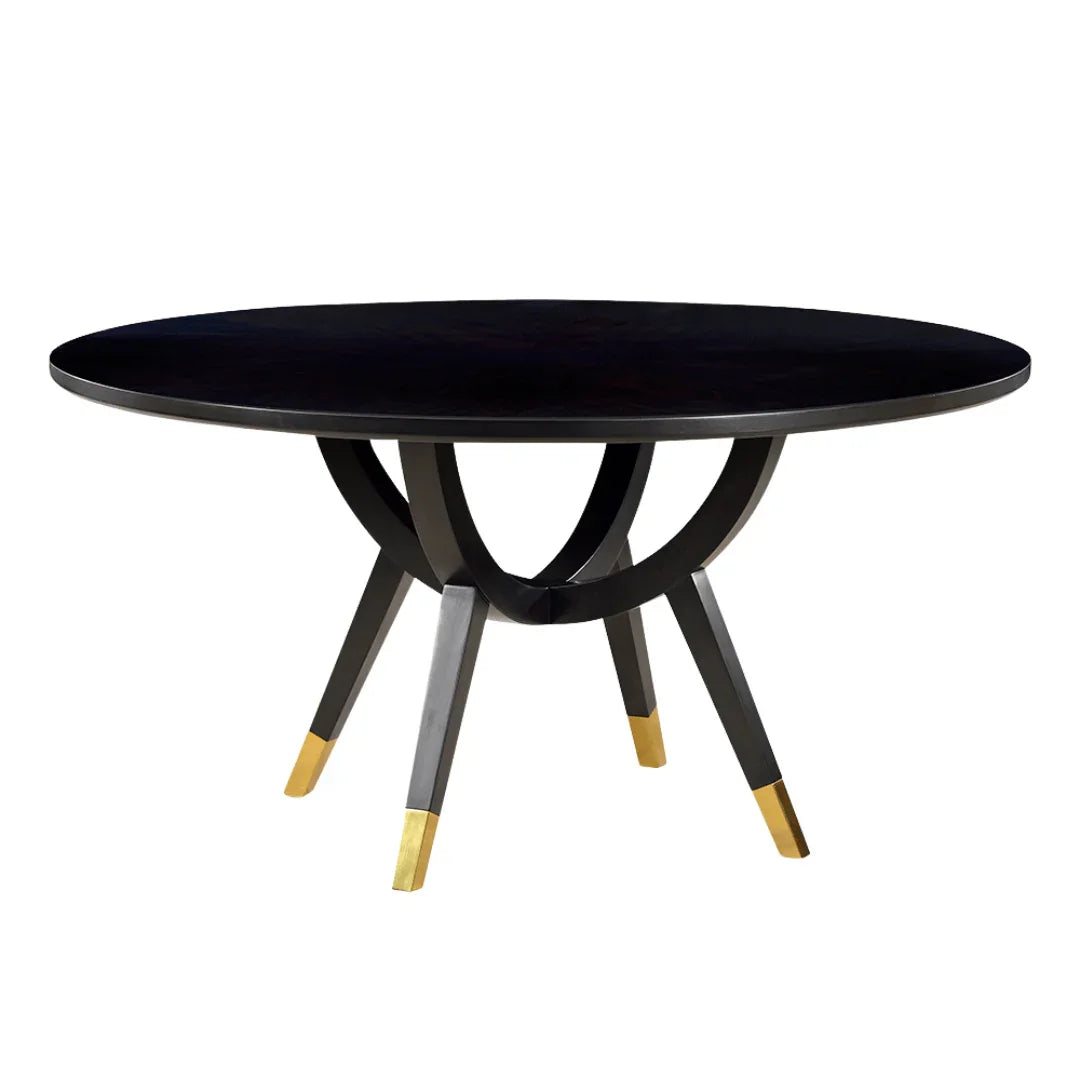 Our Thomas Dining Table features a smooth, round top, a unique, bowl-shaped base, flared, tapered legs, and brass ferrules