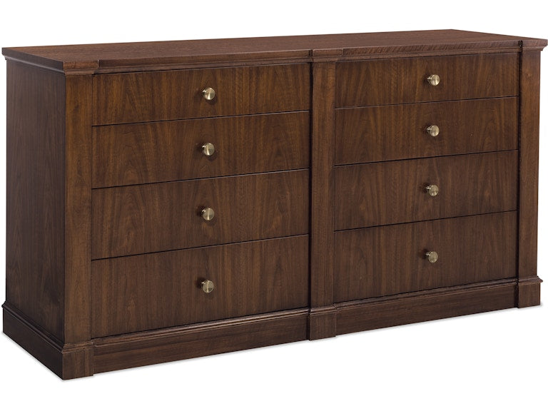 For ample storage and luxurious style, the Archives Eight-Drawer Dresser is the perfect choice. Featuring a Classic Walnut finish over figured walnut veneers, this dresser offers eight spacious drawers, including cedar-lined bottom drawers and a jewelry tray. The satin brass hardware adds a polished touch to this timeless, elegant design.