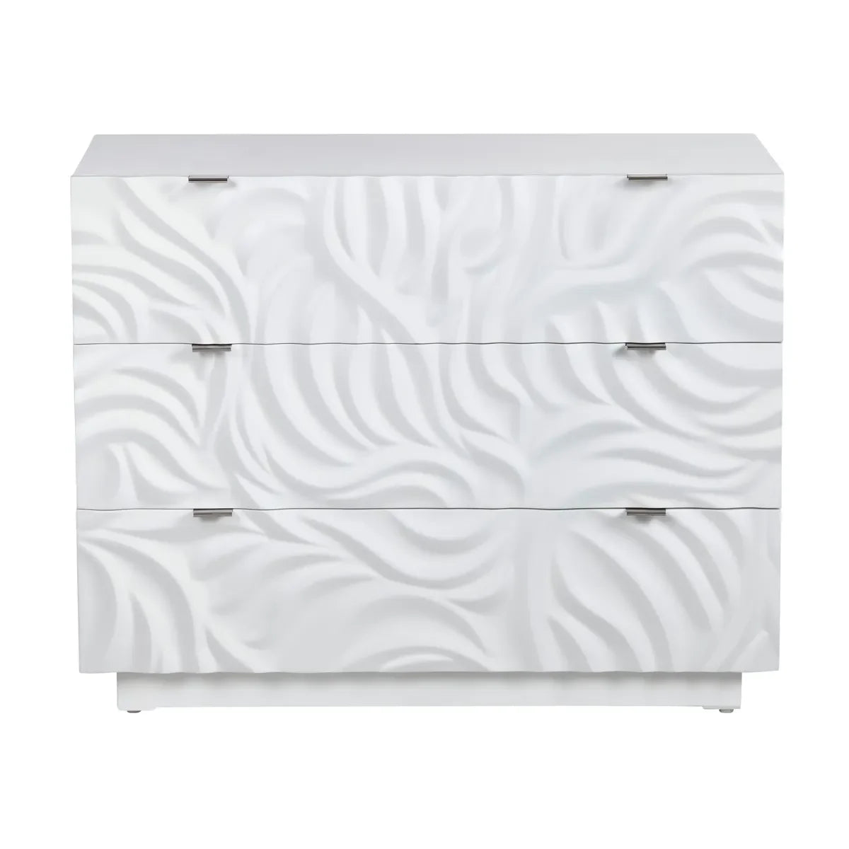 Make a bold design statement with this modern white three-drawer accent chest. Its sculptural, wave-like drawer fronts create a stunning visual texture, enhanced by the sleek matte finish. Smooth metal pulls and a flush base complete the streamlined look. Ideal for storing essentials while adding a pop of contemporary flair to bedrooms, living areas, or entryways.