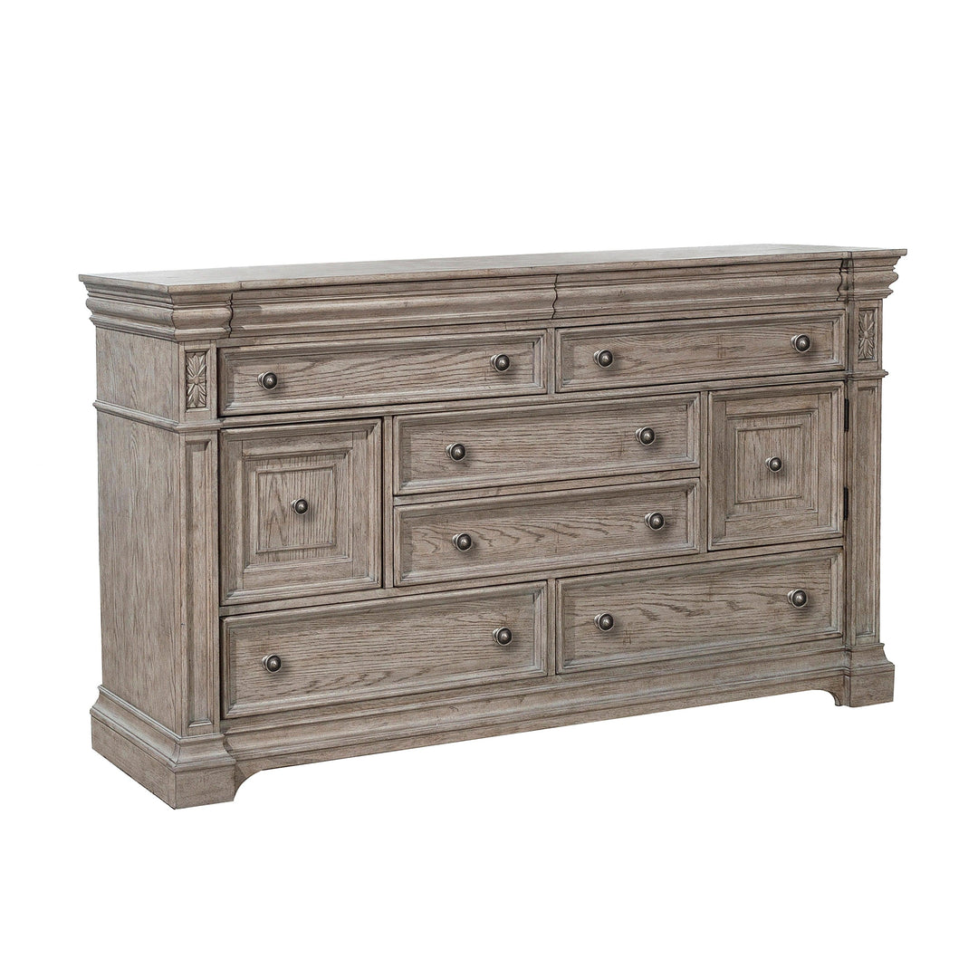The Kingsbury Dresser brings together timeless European design, grand scale and a relaxed French Gray finish on Oak Veneers to exude casual elegance. Carved elements and prominent moldings create a bespoke yet inviting style. Featuring 8 drawers and two doors, the bottom drawers are cedar-lined, and all drawers have smoothly-operating metal ball-bearing side guides and high-quality English dovetail drawer construction. Accented by fluted knobs with a pewter finish.