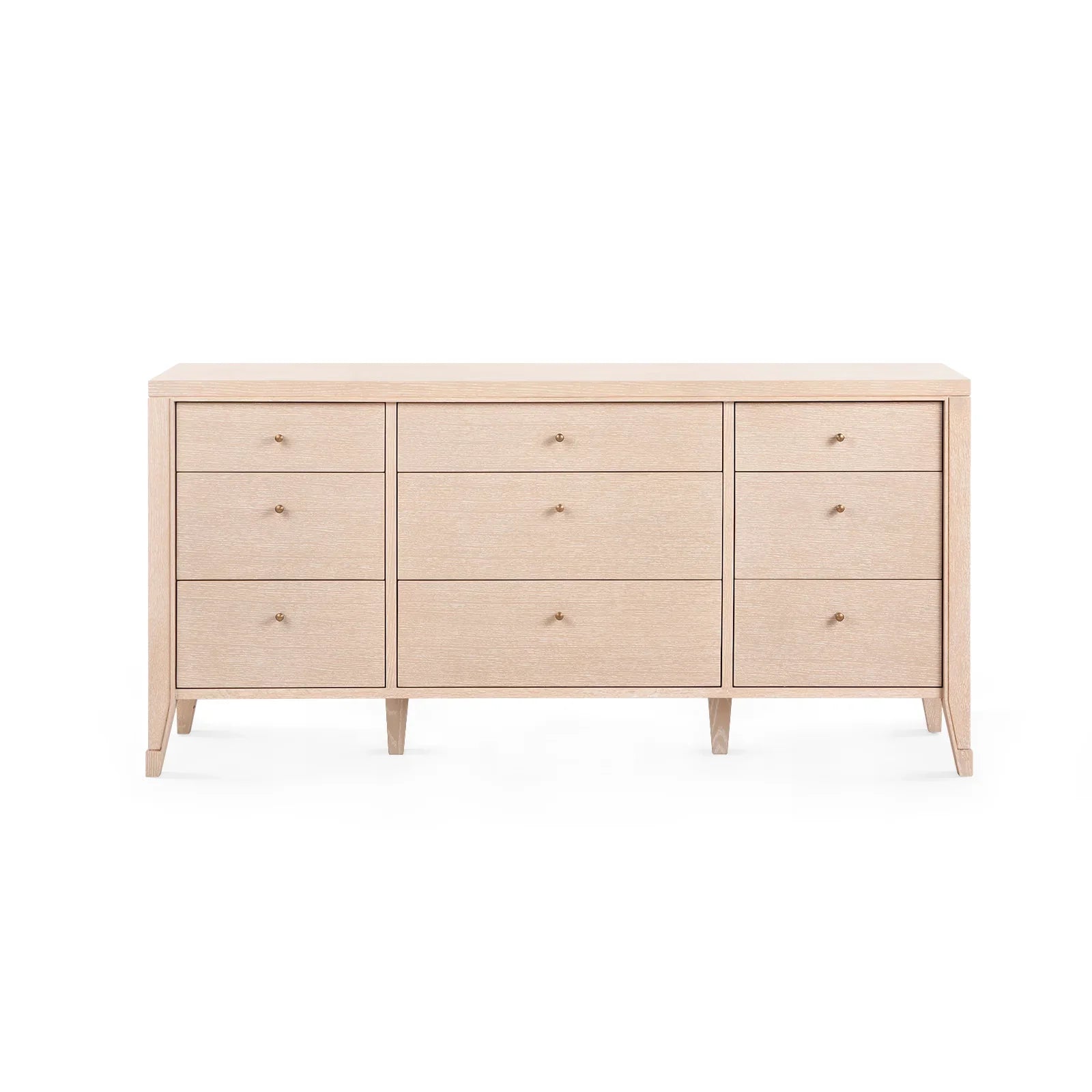The Paola 9-Drawer Extra Large Dresser features oak veneer interior, soft closing glides, and bronze pulls. The straight, parallel lines use shadow to affect the appearance of a piece and amplify the furniture's reveals. As a light-colored wooden storage piece, there is a hint of something almost Scandinavian, but the overall impression is chic and French with its hand-carved channeled details and subtle accents. The stylish Paola Collection feels dressy while simultaneously being open and airy.
