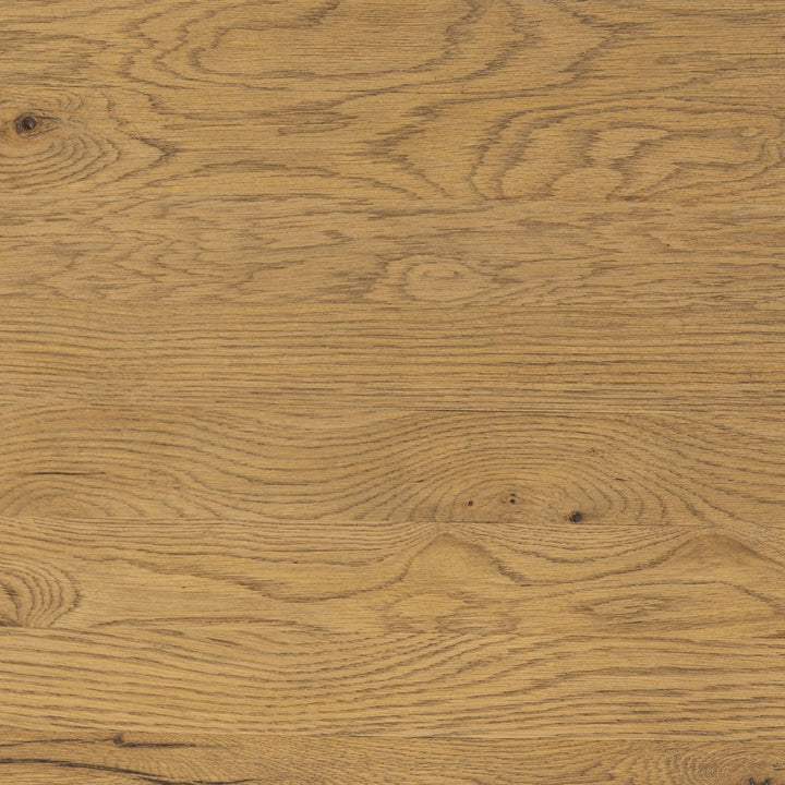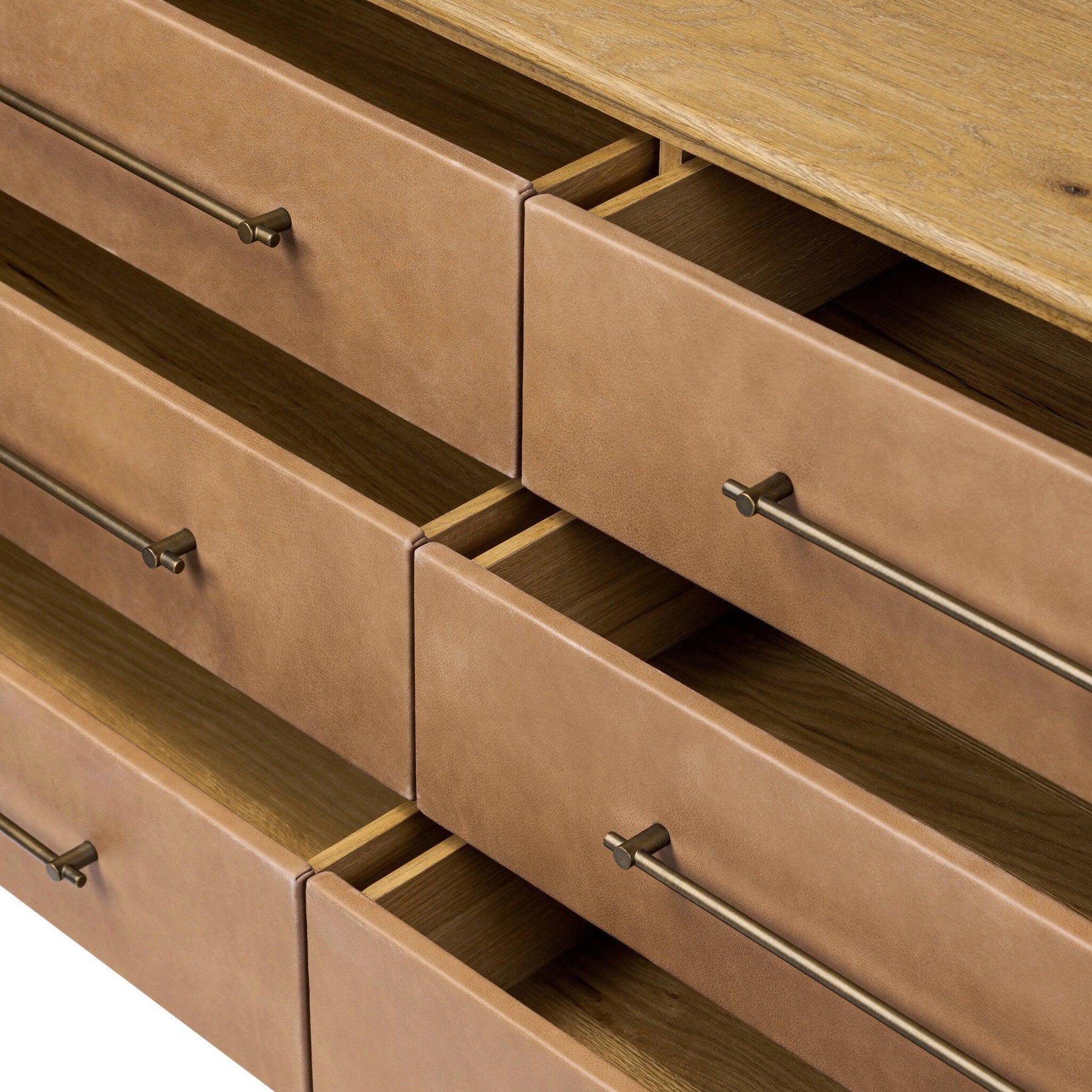 Bring a Nordic material-driven look to your bedroom with a six-drawer dresser of grain-rich oak and drawer fronts covered with tan top-grain leather. Finished out with long linear iron hardware.