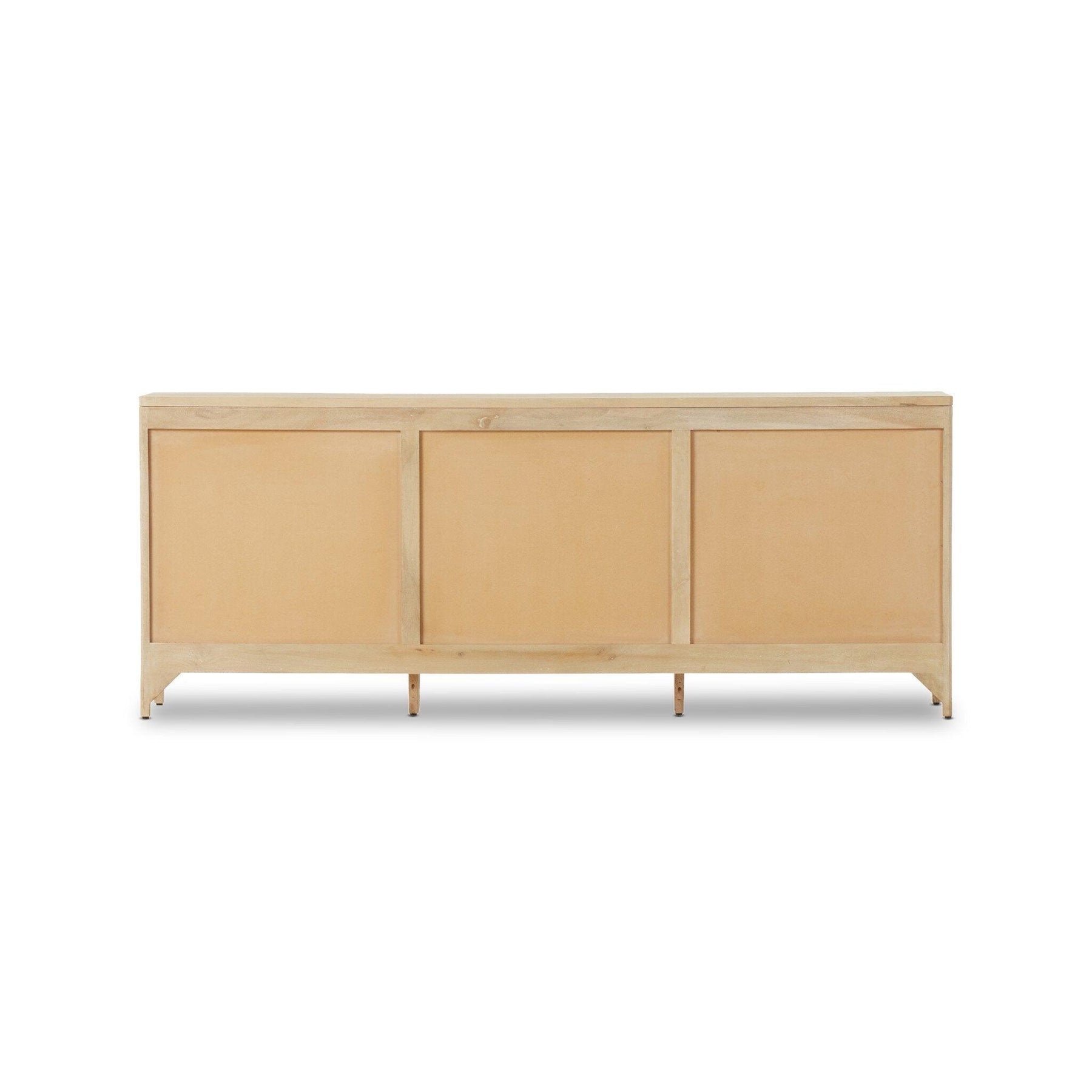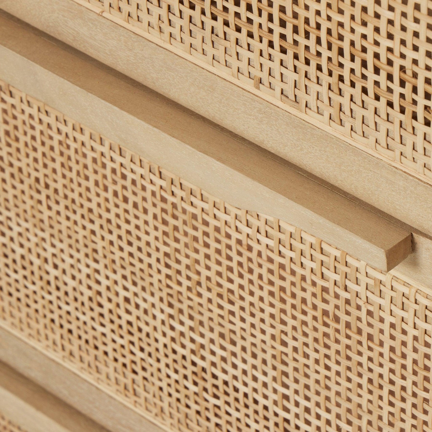 Natural mango encases nine spacious drawers of woven cane for a textural look with eye-catching contrast.