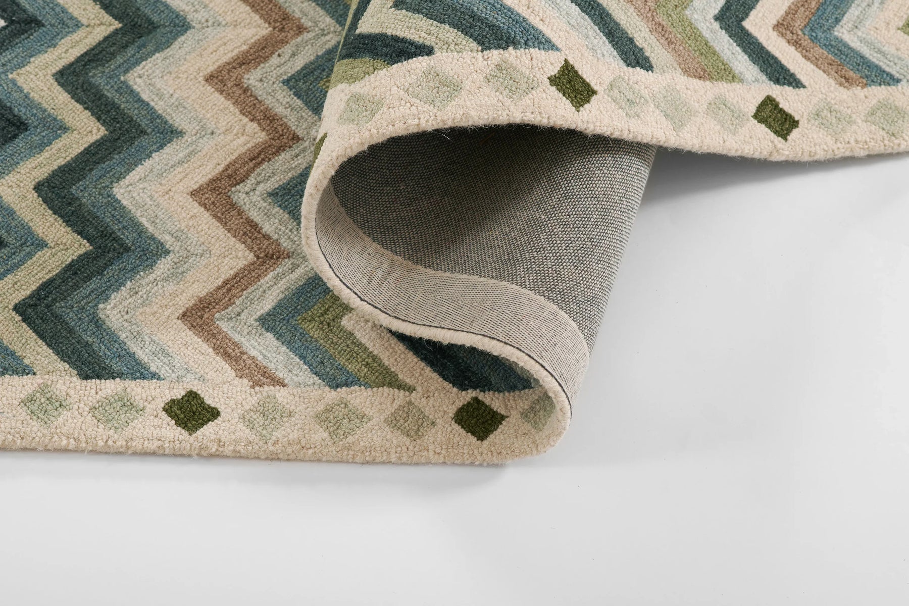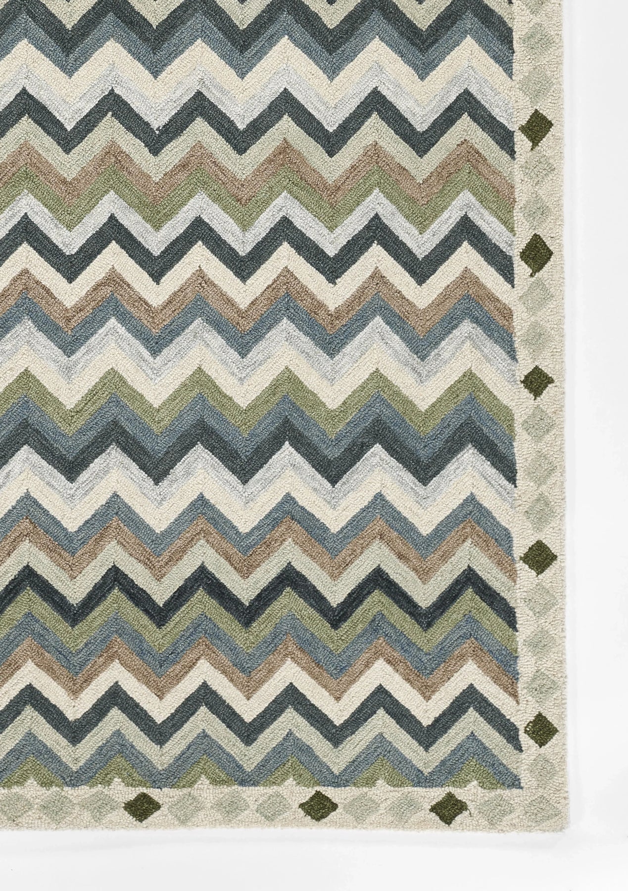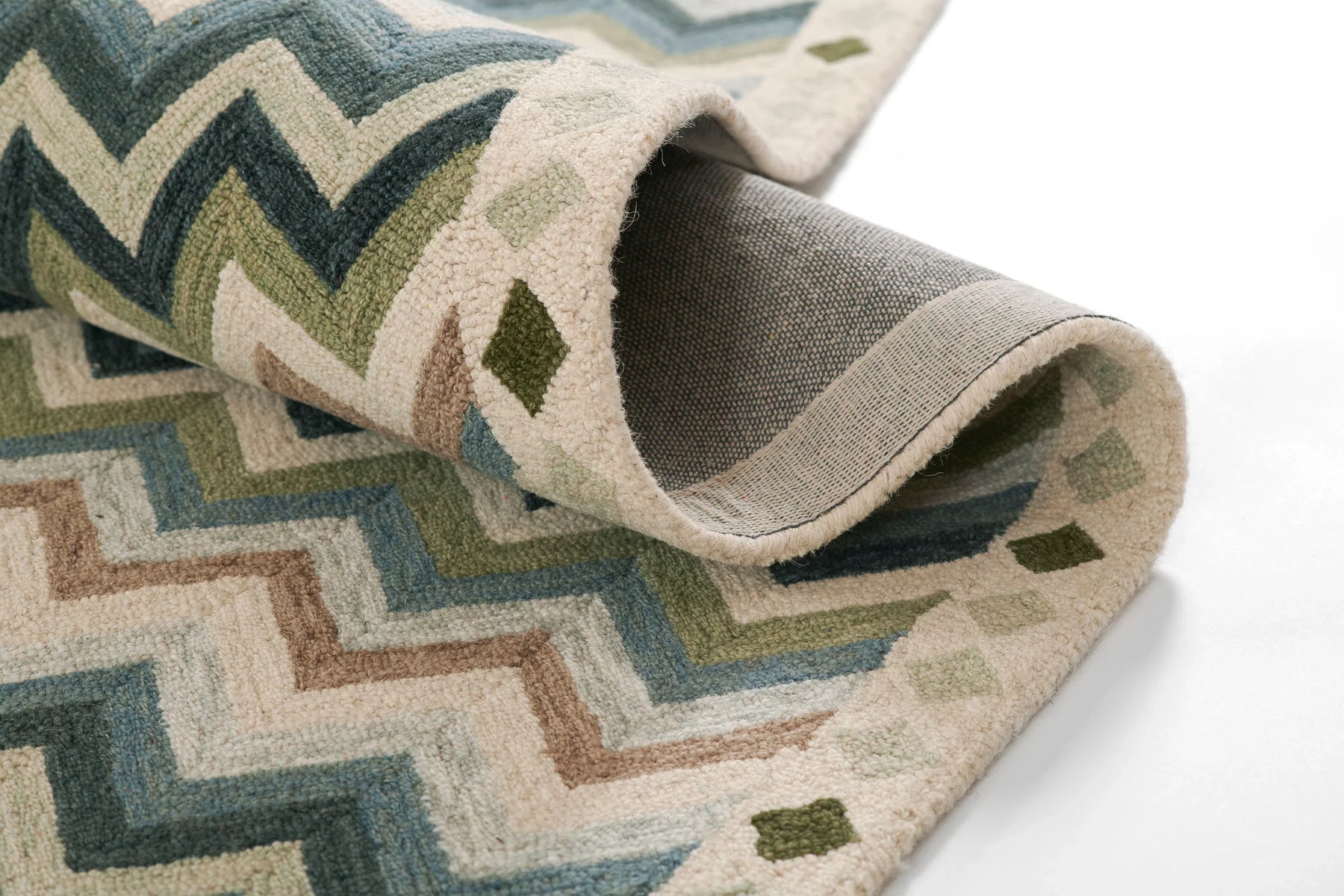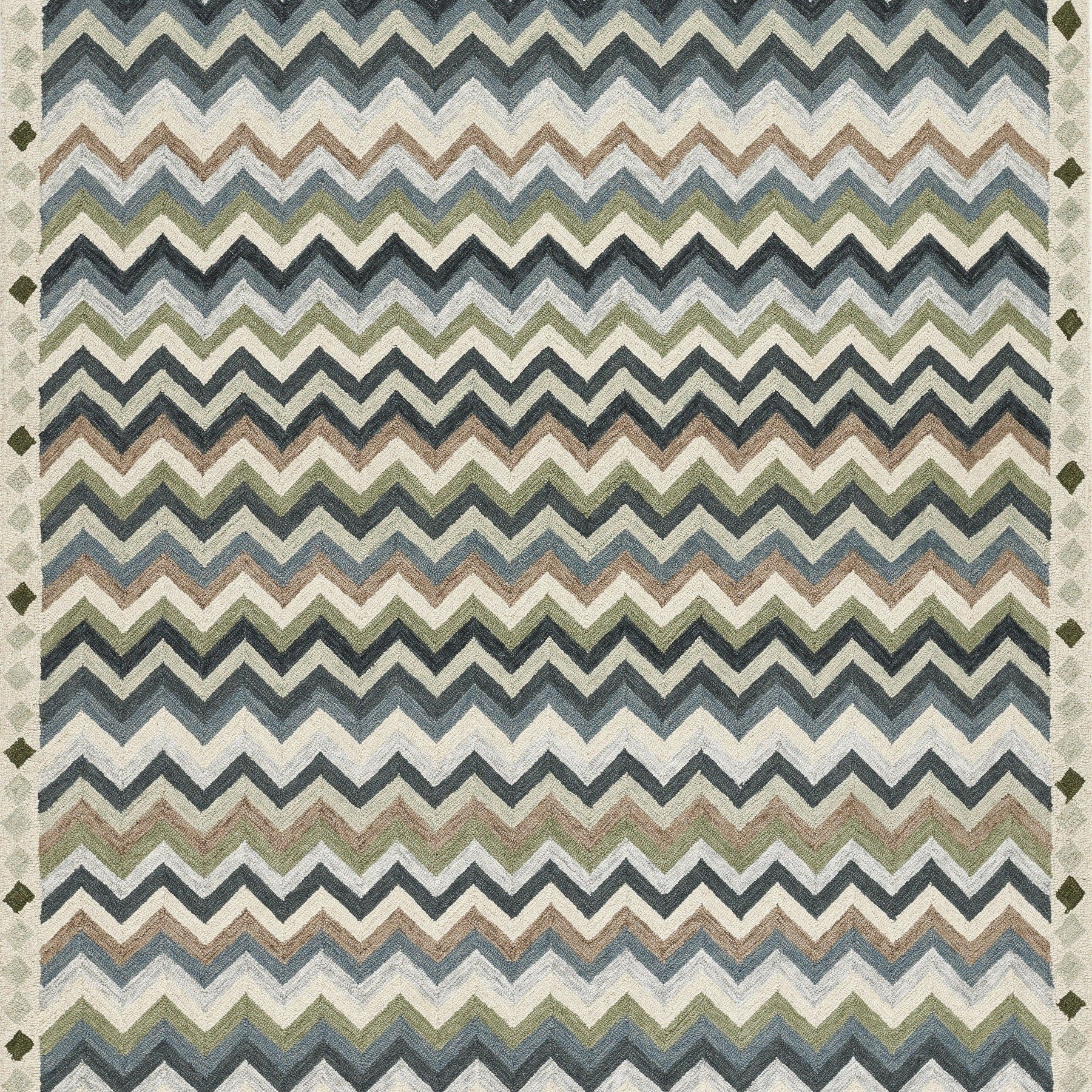Infuse your space with vibrant heritage and modern flair with this multicolor blue geometric rug from the Abbot Collection. Inspired by the bold geometry of vintage Turkish Kilims, this rug features a dynamic chevron pattern in a curated palette of earthy greens, denim blues, warm taupes, and soft blush tones—blending tradition with a distinctly contemporary aesthetic. Crafted from 100% wool and hand-tufted by skilled artisans in India, this rug offers a soft, durable surface designed to resist shedding. The zigzag design introduces movement and texture to your space, while the clean symmetry keeps the overall look grounded and versatile. Perfect for living rooms, dining areas, or bedrooms, this rug is a statement piece that balances heritage patterning with modern color sensibility.